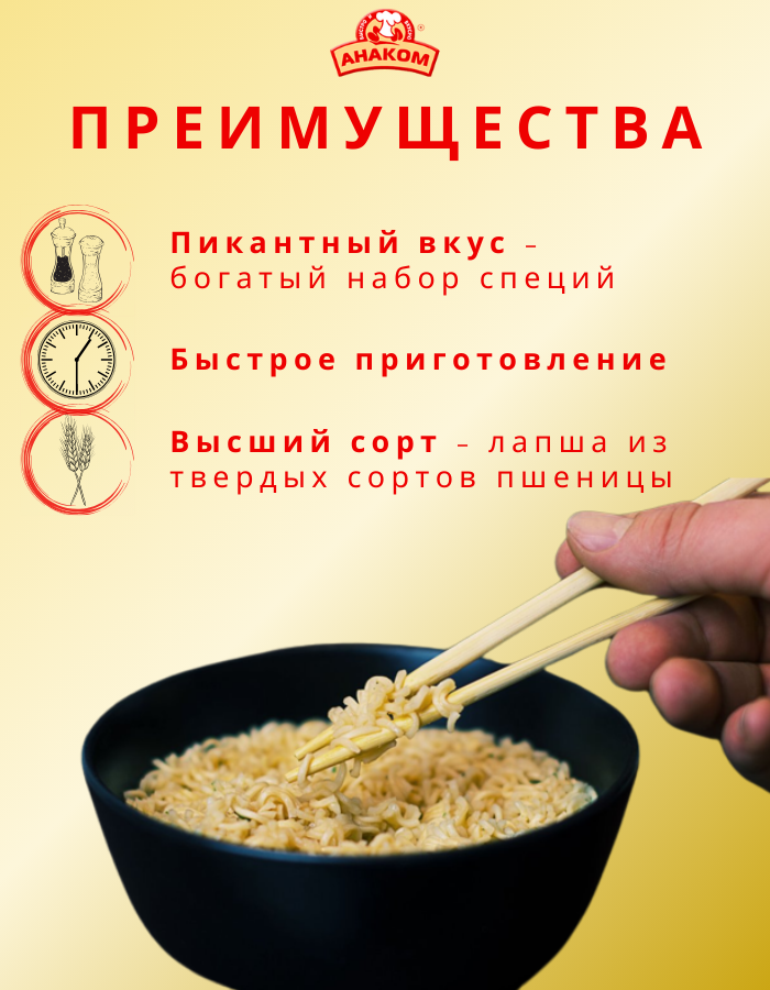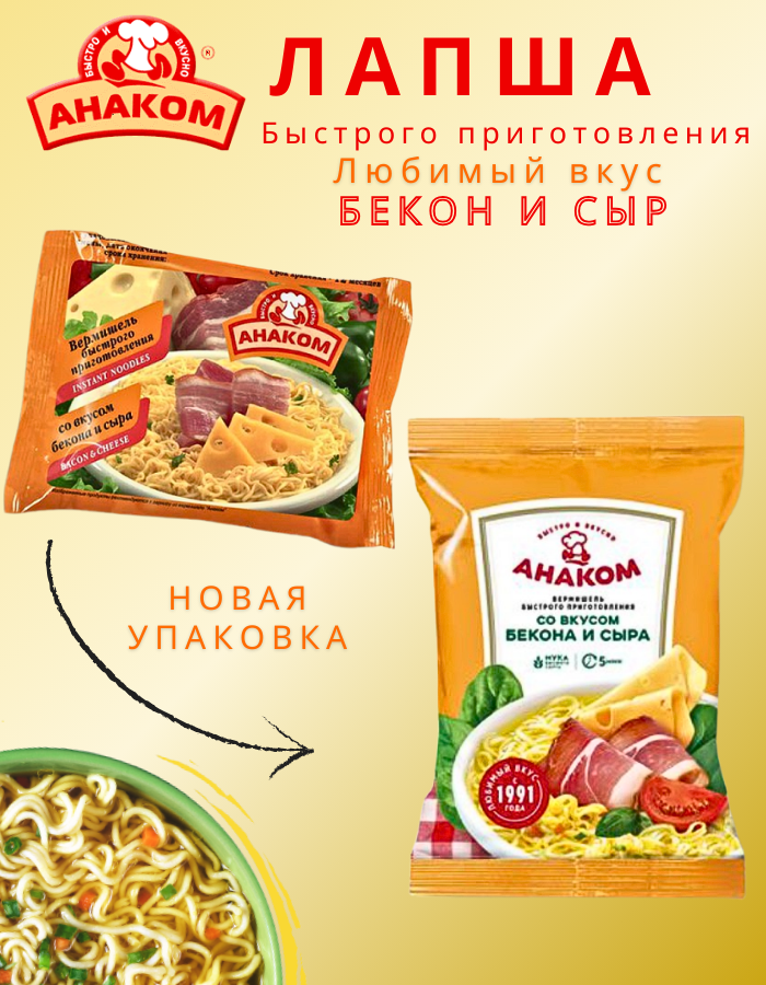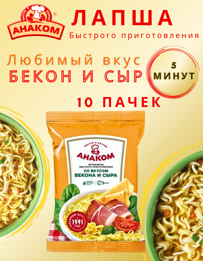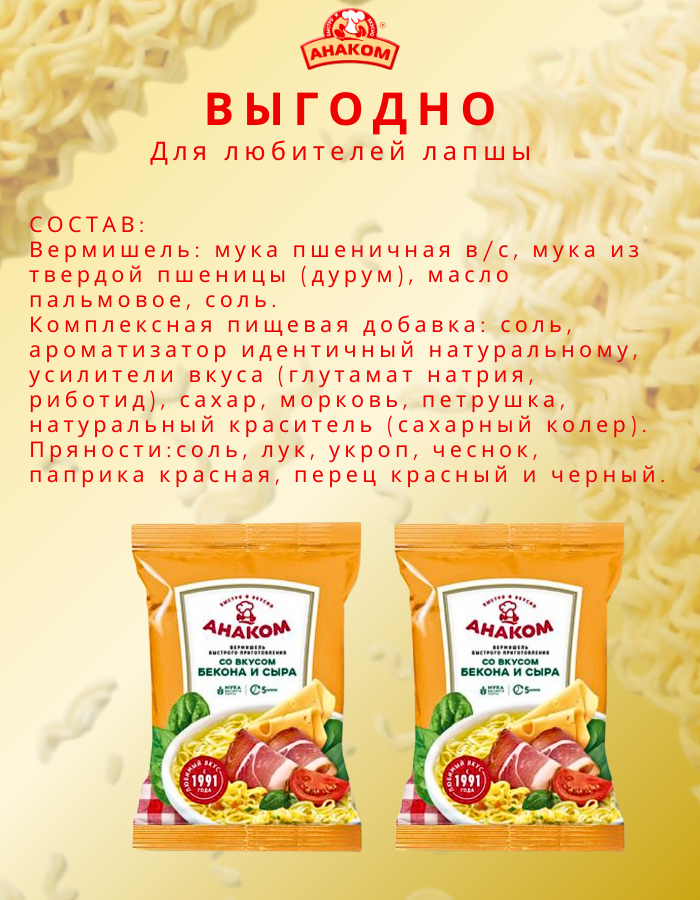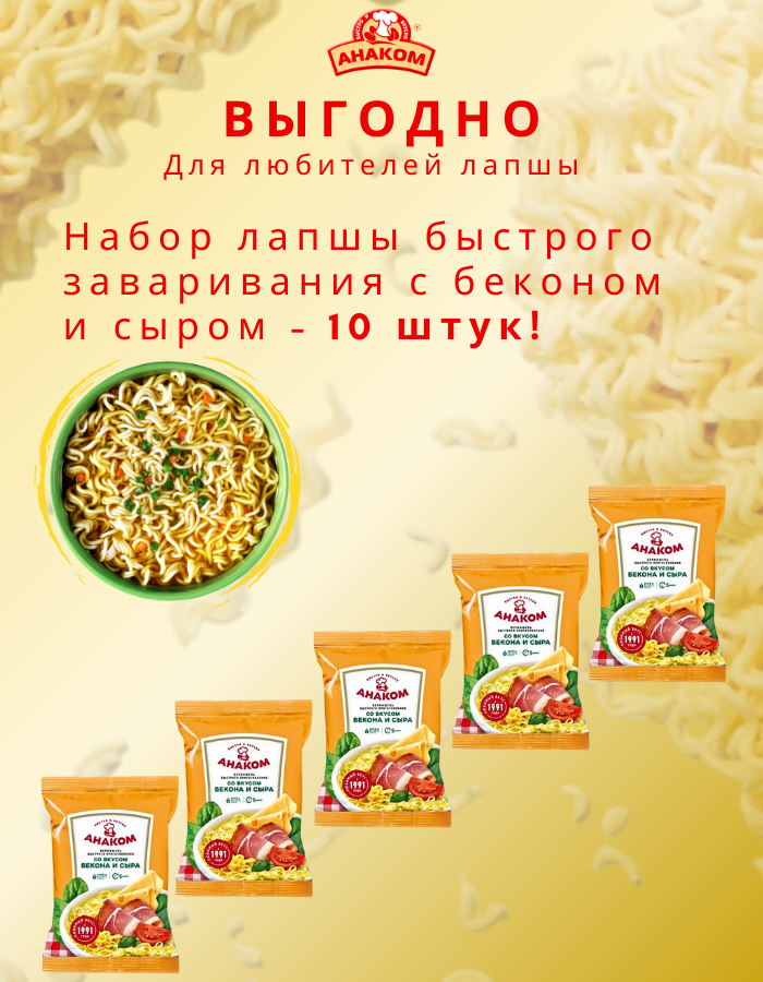 Вермишель быстрого приготовления Анаком с беконом и сыром / 60 грамм / 10 штук интересное: