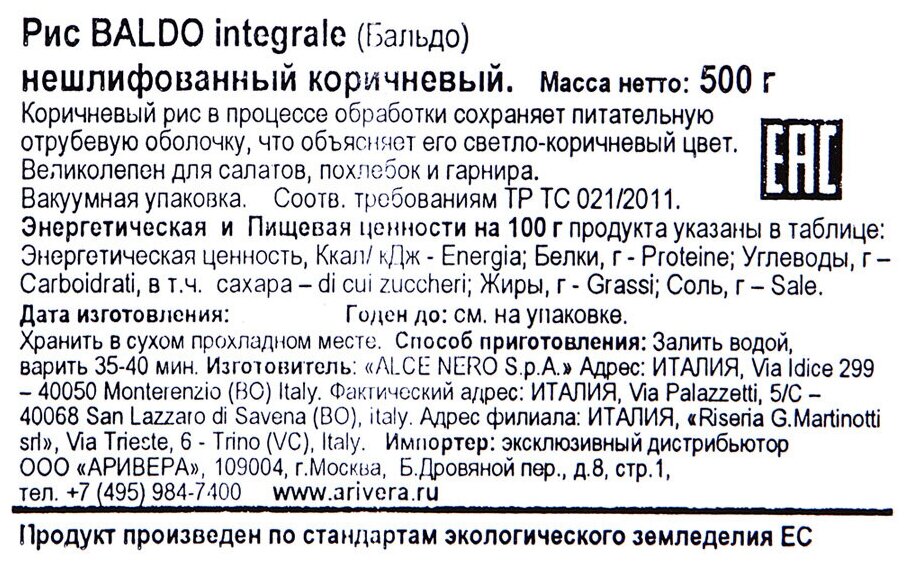 Alce Nero Рис Baldo Integrale нешлифованный коричневый, упаковка 500 г интересное: