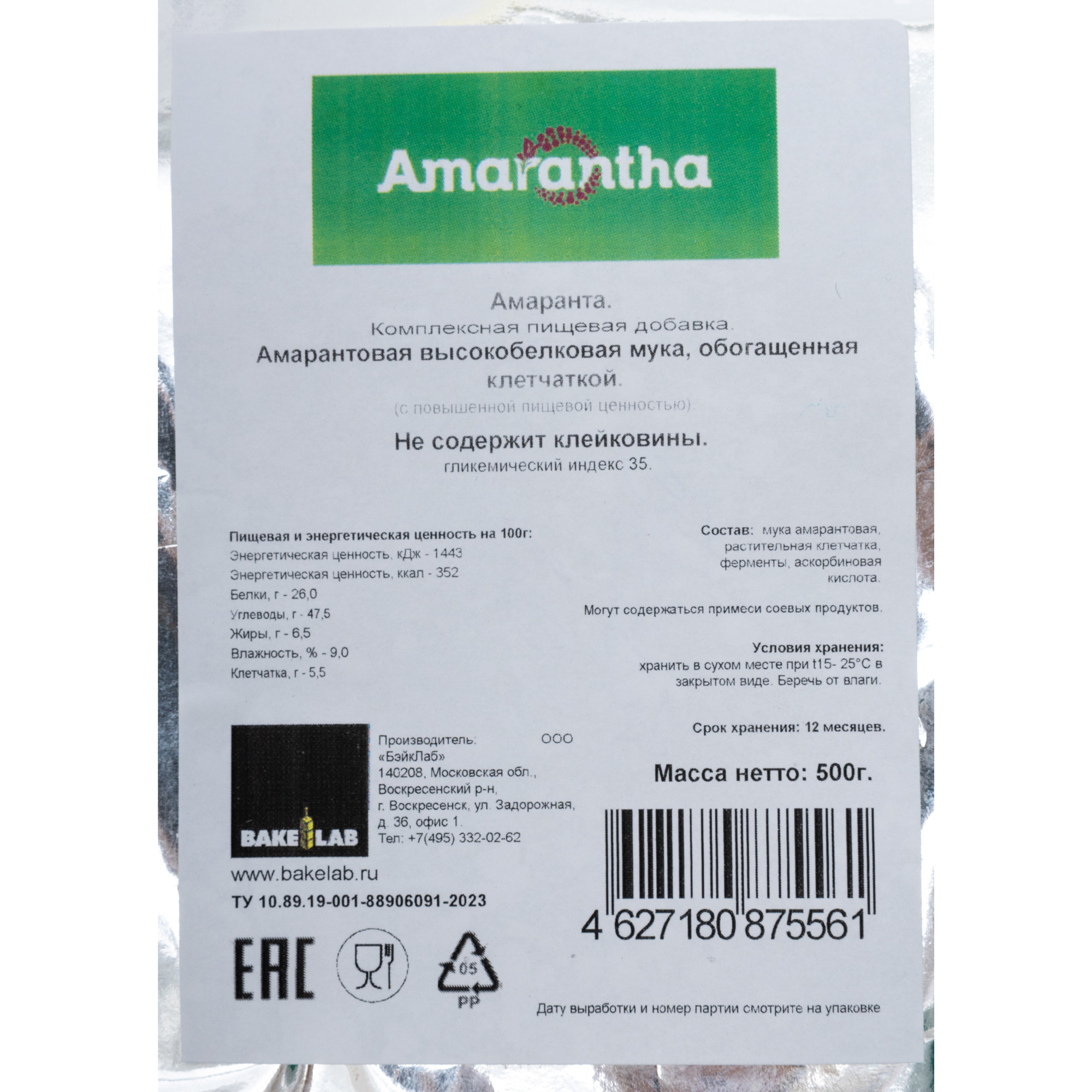 | Состав | мука амарантовая - более 97%, клетчатка - менее 3%, ферменты и витамин С - менее 0,5% в следовых количествах |