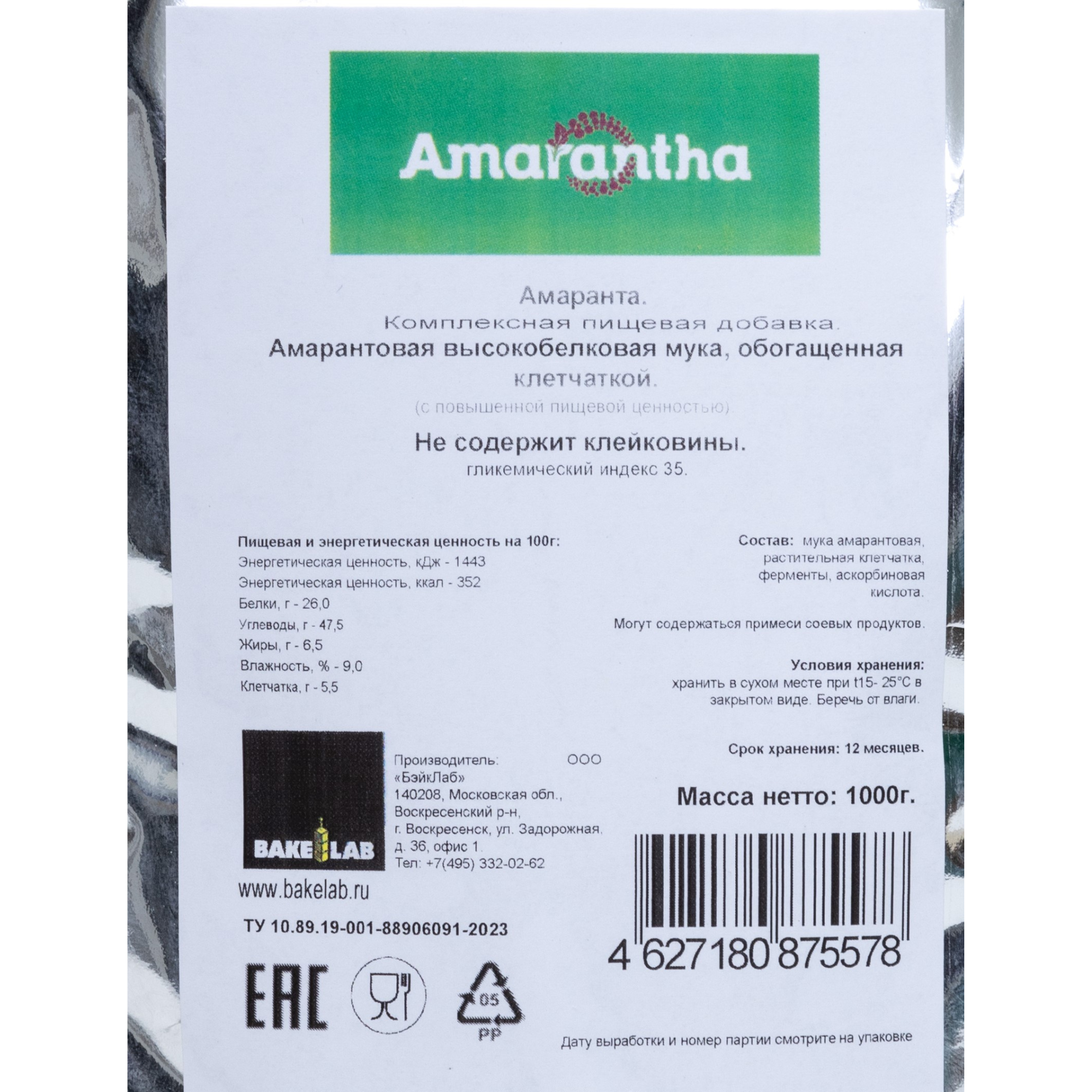 | Состав | мука амарантовая - более 97%, клетчатка - менее 3%, ферменты и витамин С - менее 0,5% в следовых количествах |