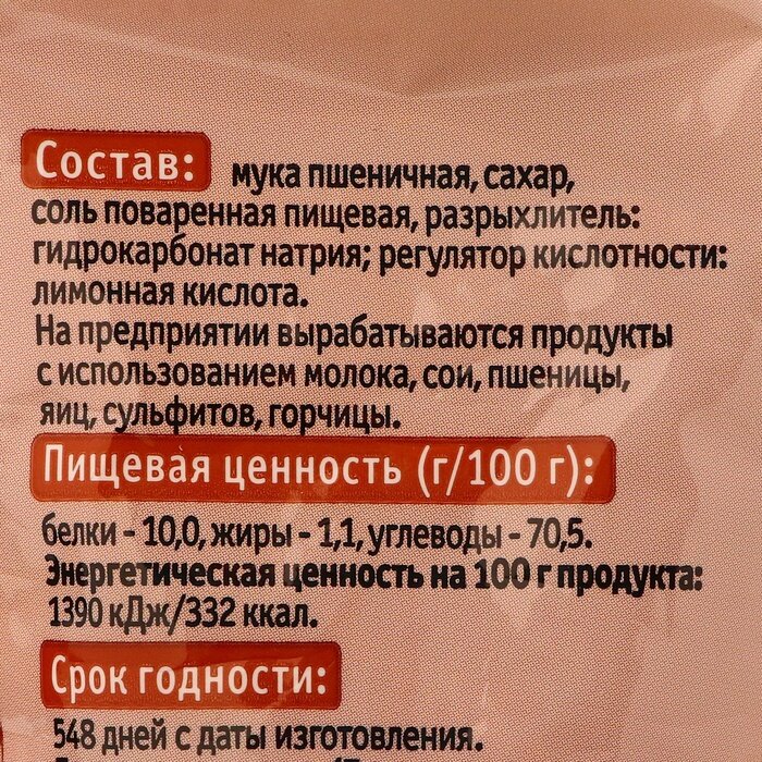 | Состав | мука пшеничная, сахар-песок, порошок яичный, соль поваренная пищевая, разрыхлители , лимонная кислота. |