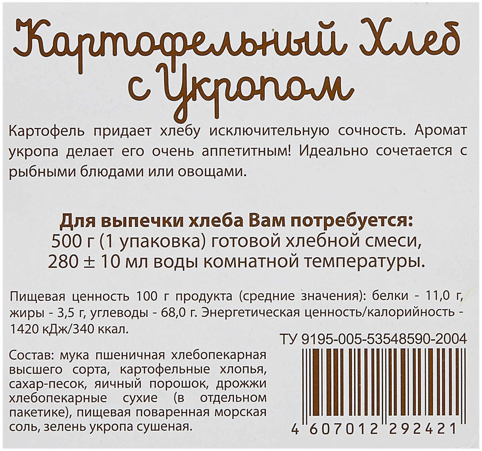 | Состав | мука пшеничная хлебопекарная высшего сорта, картофельные хлопья, сахар белый, яичный порошок, дрожжи хлебопекарные сухие (в отдельном пакете), пищевая морская соль, зелень укропа сушеная. Может содержать следы сои, орехов, арахиса, кунжута, сельдерея, горчицы. |