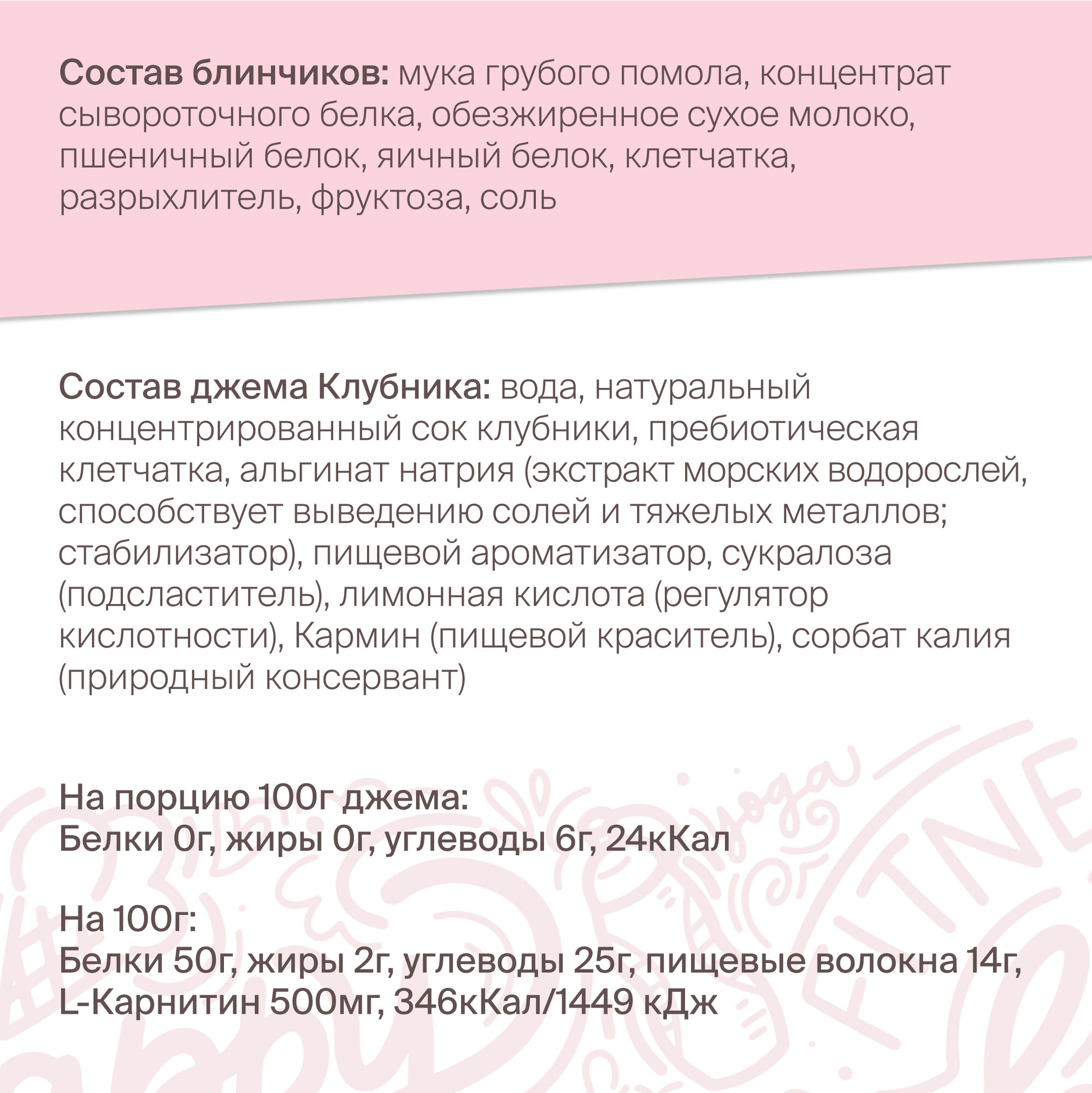 | Состав | Фитнес блины: Мука грубого помола, концентрат сывороточного белка, обезжиренное сухое молоко, пшеничный белок, яичный белок, клетчатка, разрыхлитель, фруктоза, соль Джем: вода, натуральный концентрированный сок клубники, пребиотическая клетчатка, альгинат натрия (экстракт морских водорослей, способствует выведению солей и тяжелых металлов; стабилизатор), пищевой ароматизатор, сукралоза (подсластитель),лимонная кислота )регулятор кислотности), Кармин (пищевой краситель), сорбат калия (природный консервант). |