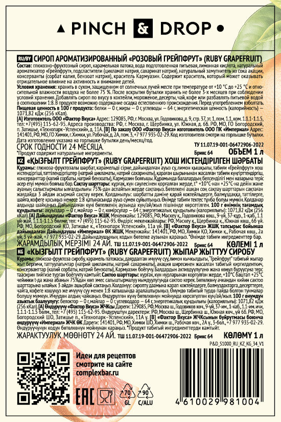 СохранитьСироп "Розовый Грейпфрут" от бренда "PINCH&DROP", стеклянная бутылка, 1 литр интересное: