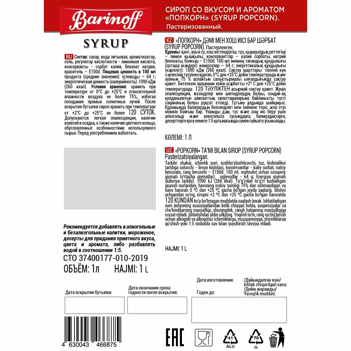 Сироп Barinoff Попкорн (для кофе, коктейлей, десертов, лимонада и мороженого), 1л интересное: