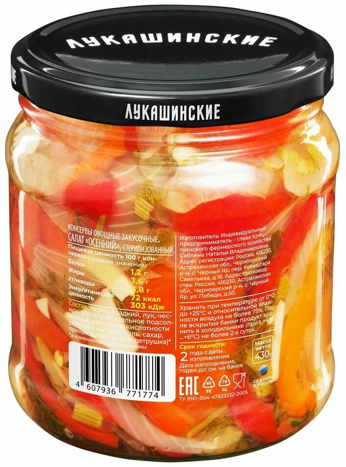 | Состав | Салат Лукашинские Осенний из сладкого перца 430 г |