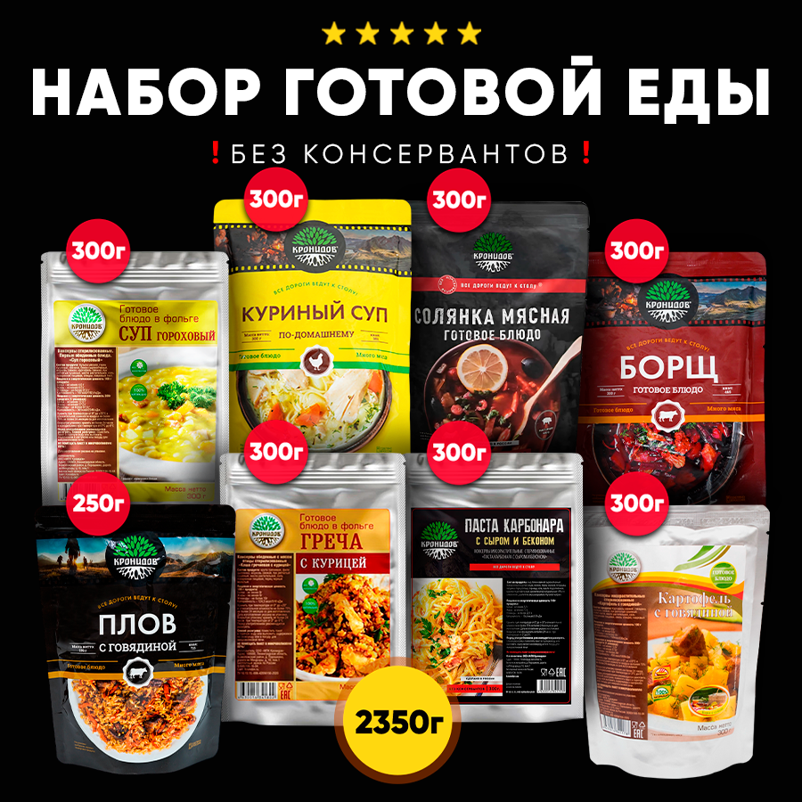 СохранитьНабор из 8 готовых блюд в фольге от ТМ "Кронидов" Картофель с говядиной, Курица с гречей, Паста Карбонара, Плов с говядиной, Суп гороховый, Куриный суп по-домашнему, Солянка, Борщ. Консервированные блюда интересное:
