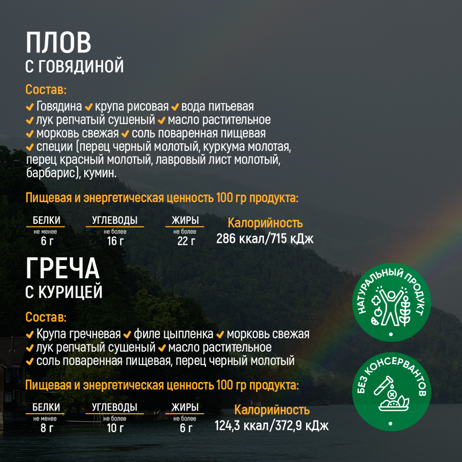 | Дополнительная информация | Состав и содержание калорий указано в инфографике для каждого блюда отдельно. |