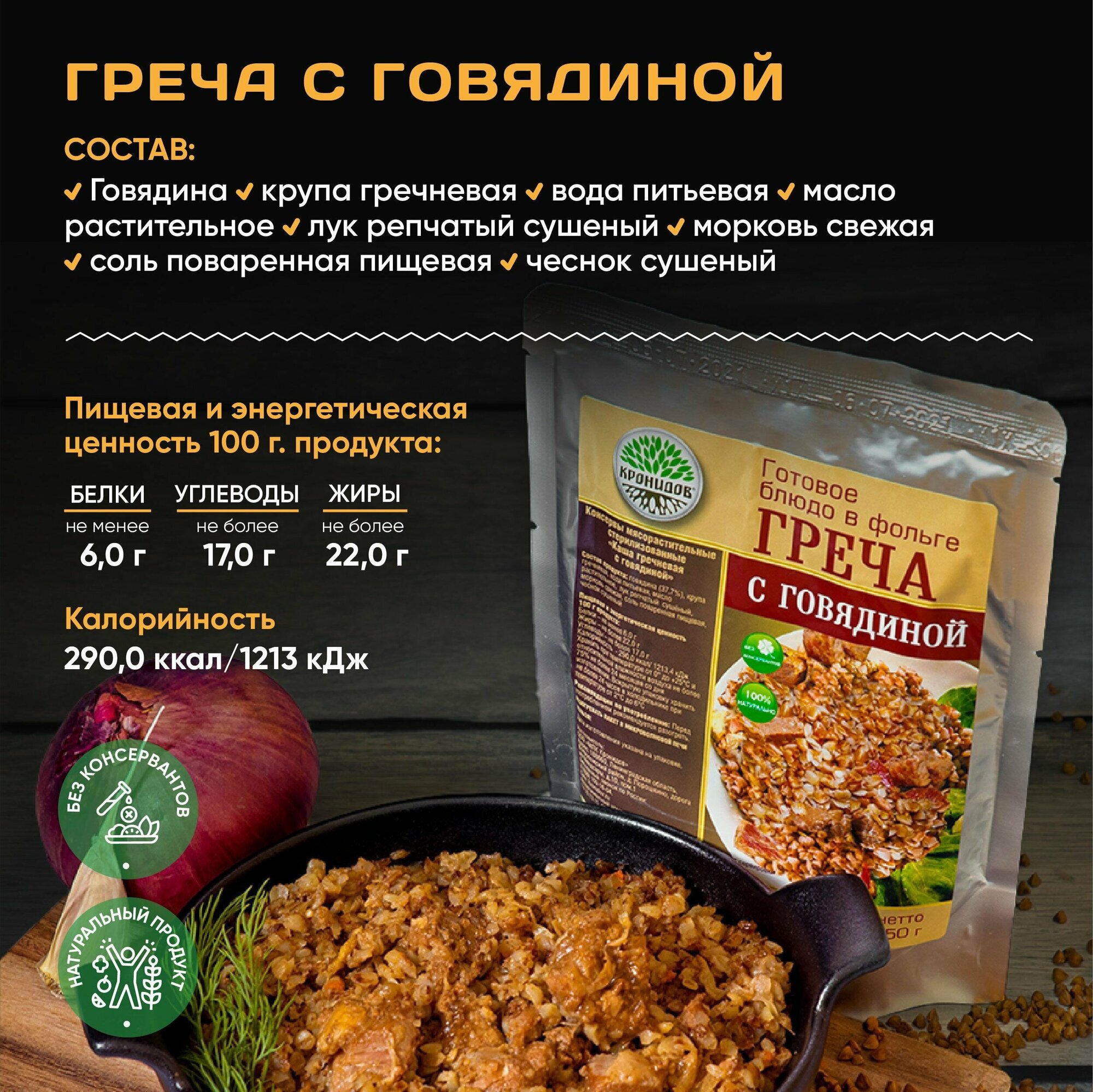 Кронидов Набор из 4 готовых блюд в реторт-пакете + Подарок БНП 1 шт. Гороховый суп/ Греча со свининой/ Макароны с говядиной/ Солянка