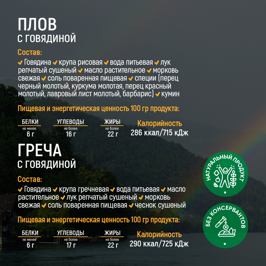 | Дополнительная информация | Состав и содержание калорий указано в инфографике для каждого блюда отдельно. |