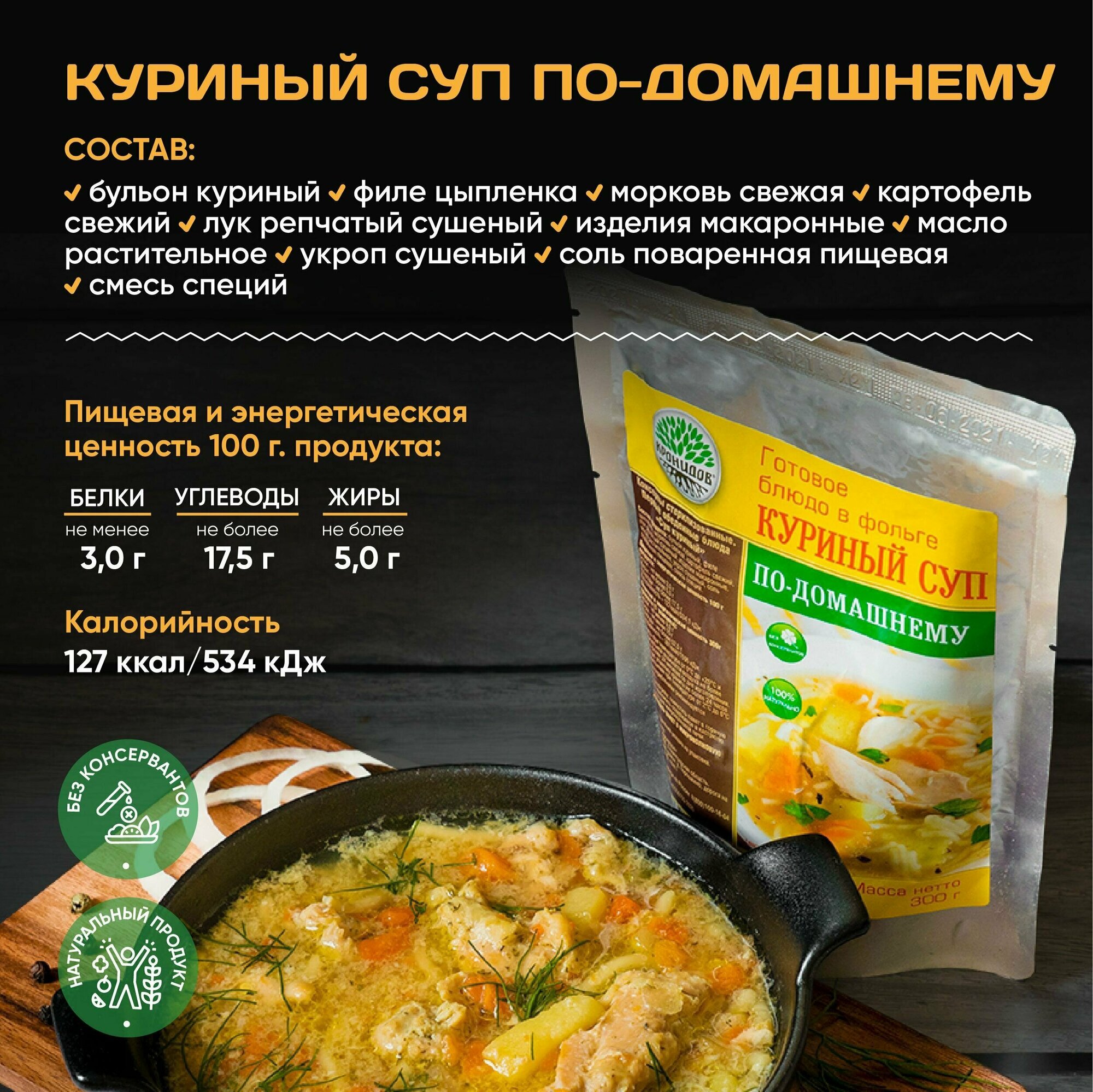 СохранитьНабор из 4 готовых блюд в фольге от ТМ "Кронидов" Греча, Рис, Макароны с говядиной, Суп куриный по-домашнему. Консервированные блюда интересное: