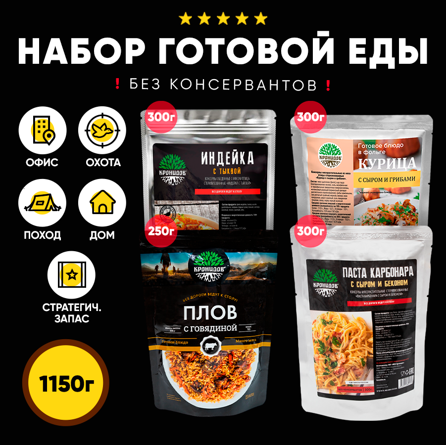 СохранитьНабор из 4 готовых блюд в реторт-пакете "Кронидов" Индейка с тыквой/Курица с грибами и сыром/Плов с говядиной/Паста Карбонара интересное: