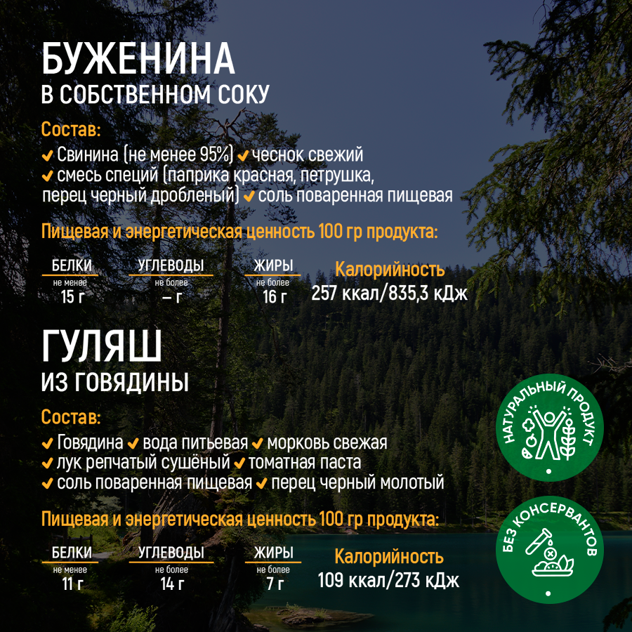 | Дополнительная информация | Состав и содержание калорий указано в инфографике для каждого блюда отдельно. |