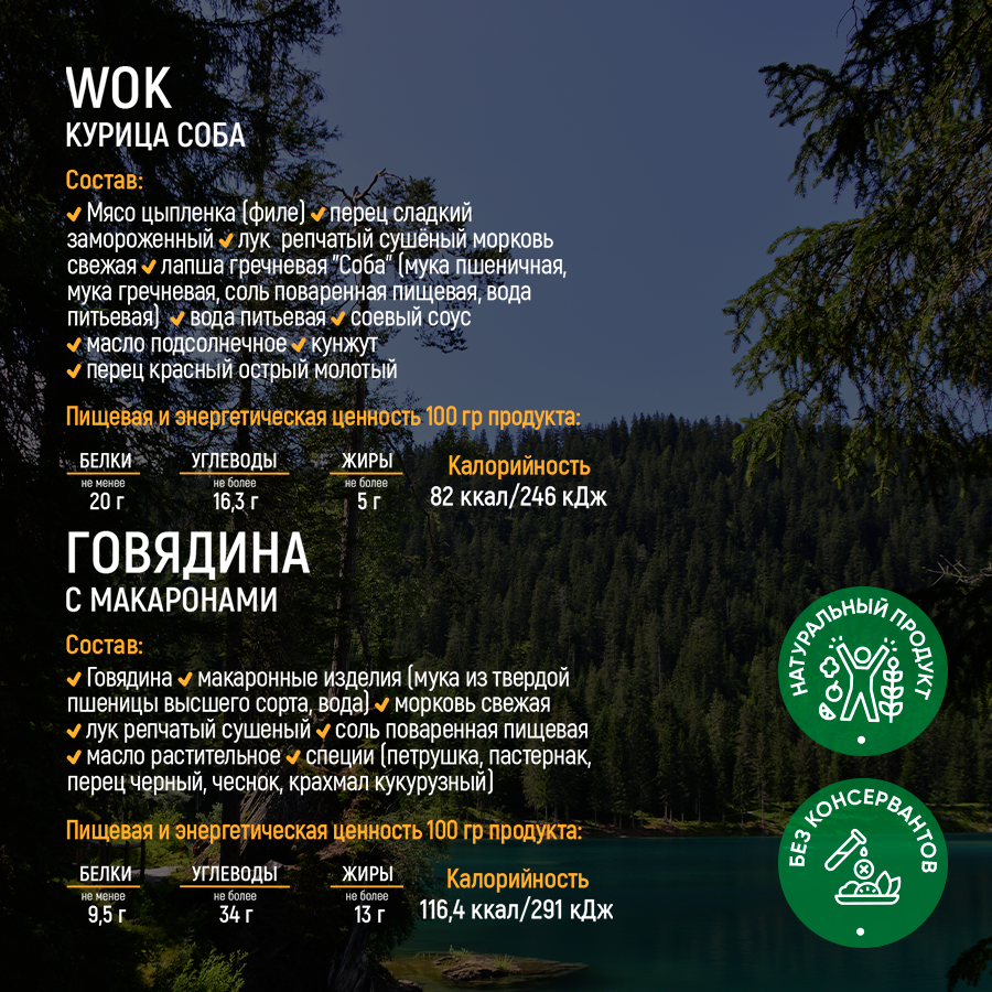 | Дополнительная информация | Состав и содержание калорий указано в инфографике для каждого блюда отдельно. |