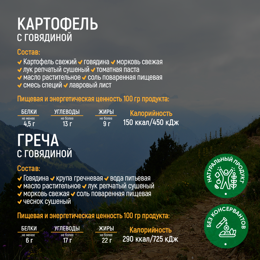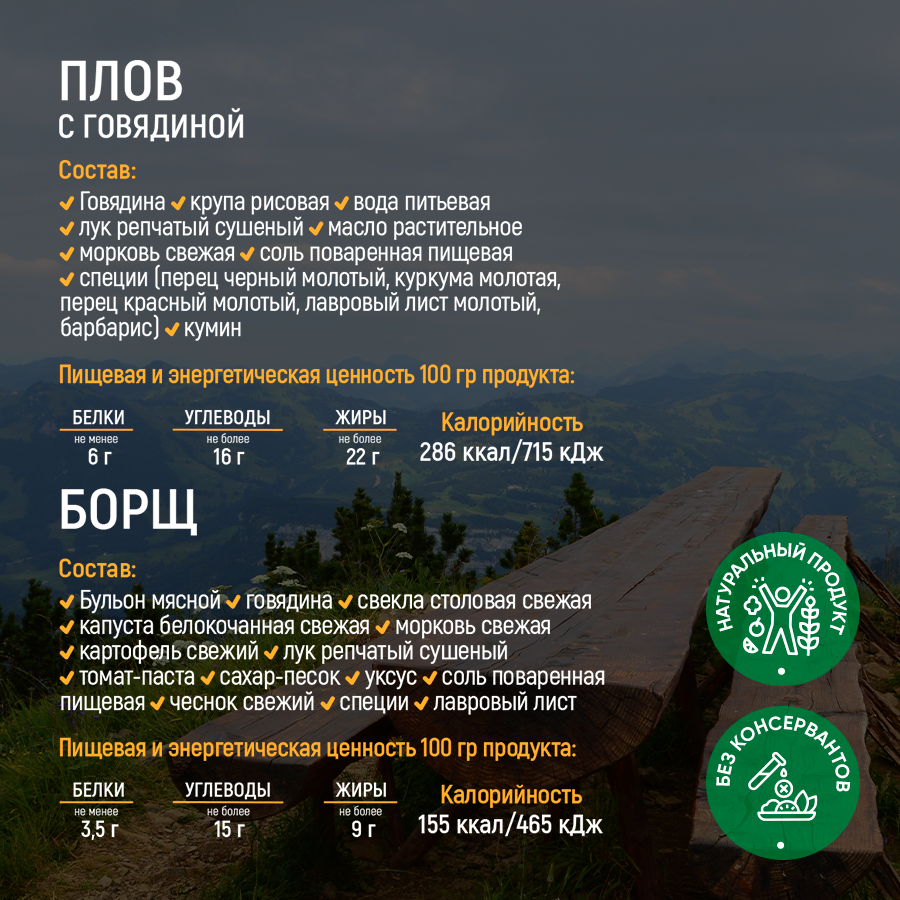 | Дополнительная информация | Состав и содержание калорий указано в инфографике для каждого блюда отдельно. |
