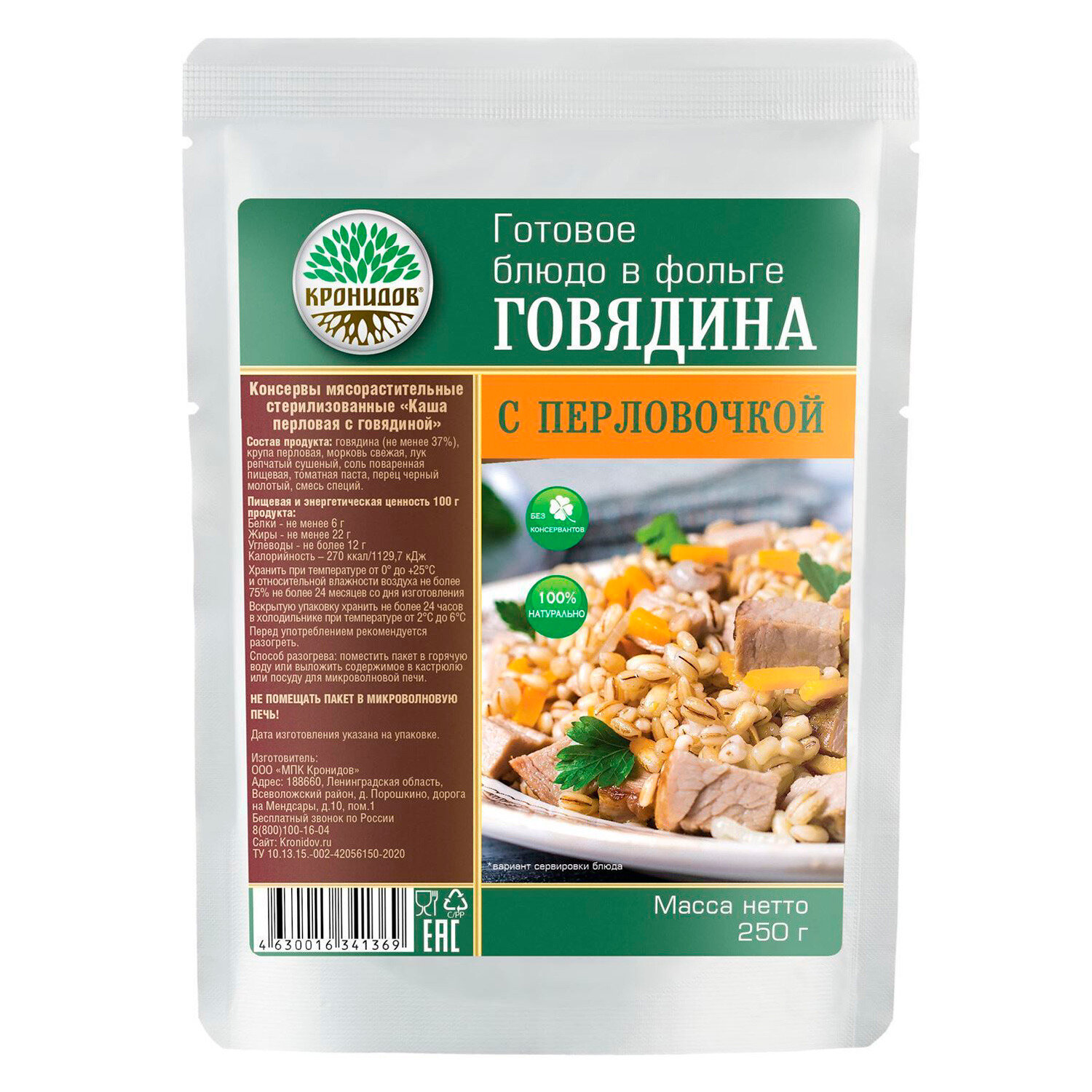 Кронидов Каша перловая с говядиной Готовое блюдо в реторт-пакете. Консервы натуральные 1 шт 250 г