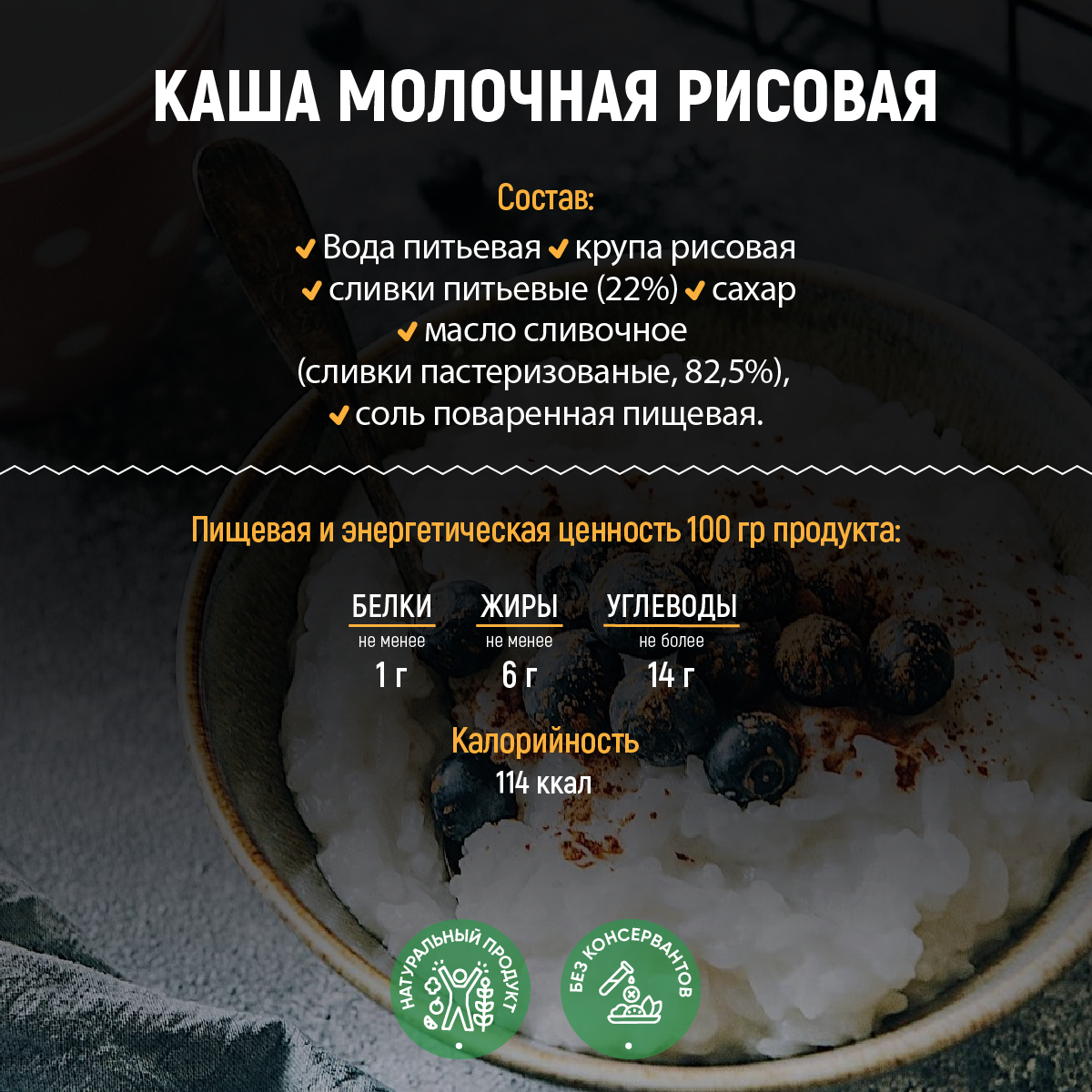 | Состав | Вода питьевая, крупа рисовая, сливки питьевые (22%), сахар, масло сливочное (сливки пастеризованые, 82,5%), соль поваренная пищевая |