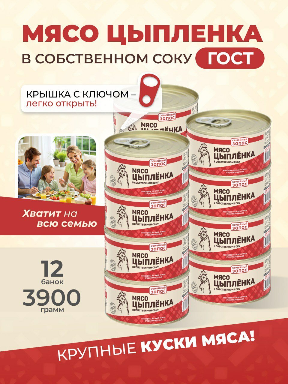 Тушенка, консервы мясные, ГОСТ, Мясо цыпленка на кости 325 гр. Семейный запас -12 шт интересное: