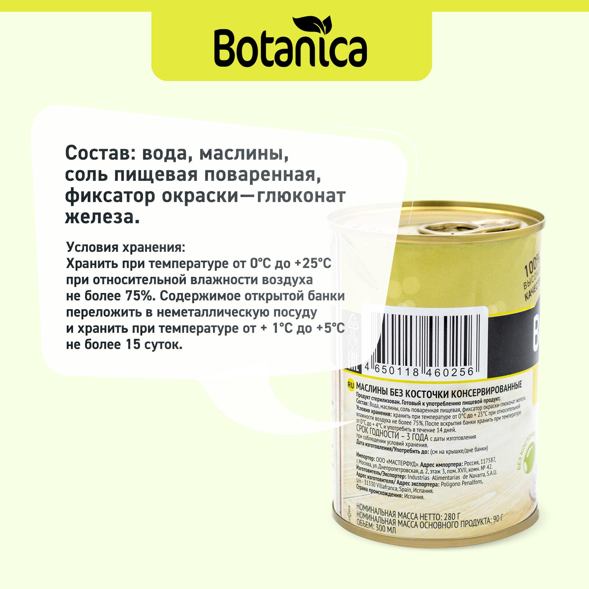 | Состав | вода, маслины, соль пищевая поваренная, фиксатор окраски - глюконат железа. |