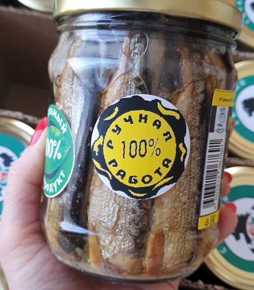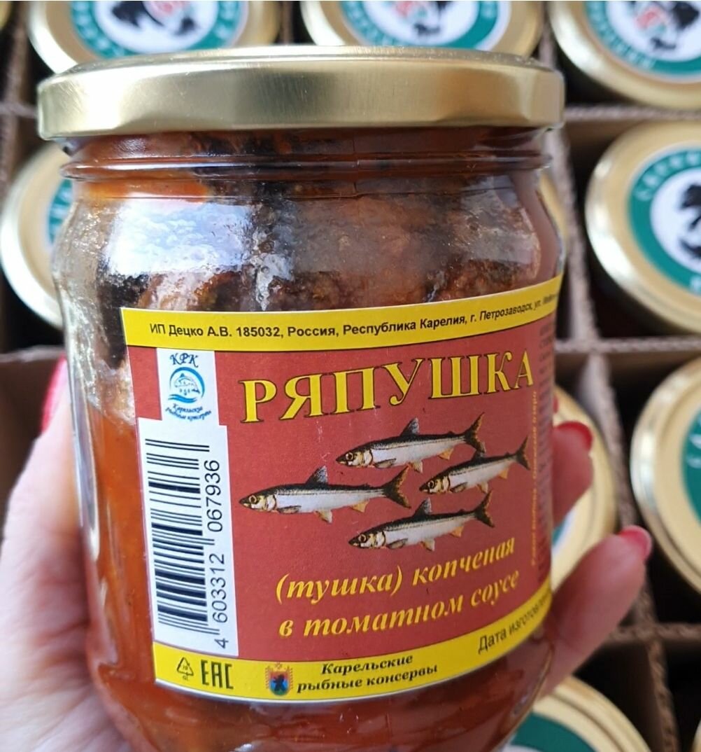 | Состав | Состав в масле: ряпушка копченая, масло растительное, соль пищевая. Состав в т/с: ряпушка копченая, томатная паста, масло растительное, морковь, лук репчатый,соль пищевая, крахмал картофельный, перец черный, перец красный острый, лавровый лист, кориандр, гвоздика. Состав в с/с: ряпушка, морковь, перец черный, масло растительное, соль пищевая, лавровый лист. |