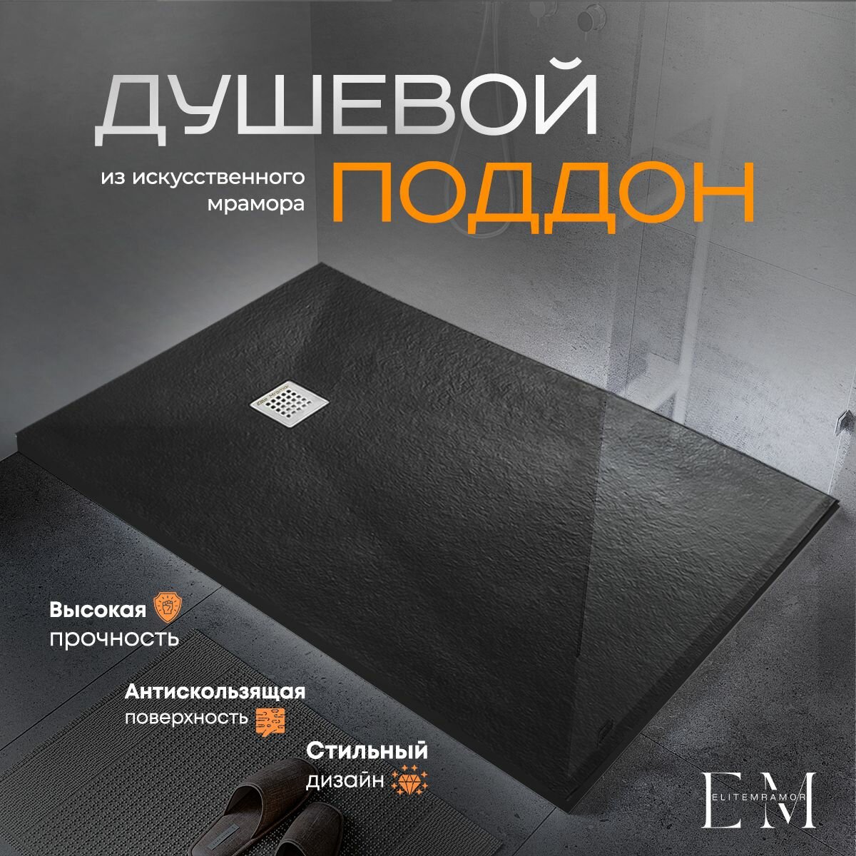 Поддон для душа 80х80 см, ELITE MRAMOR, черный искусственный камень