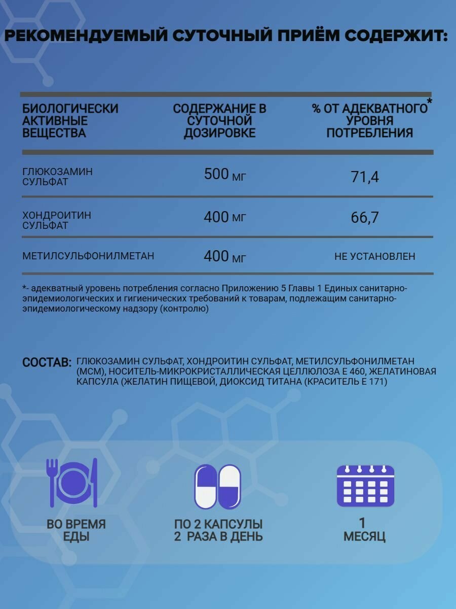 | Состав | Глюкозамин сульфат, хондроитин сульфат, метилсульфонилметан (МСМ), носитель-микрокристаллическая целлюлоза Е 460, желатиновая капсула (желатин пищевой, диоксид титана (краситель Е 171) |