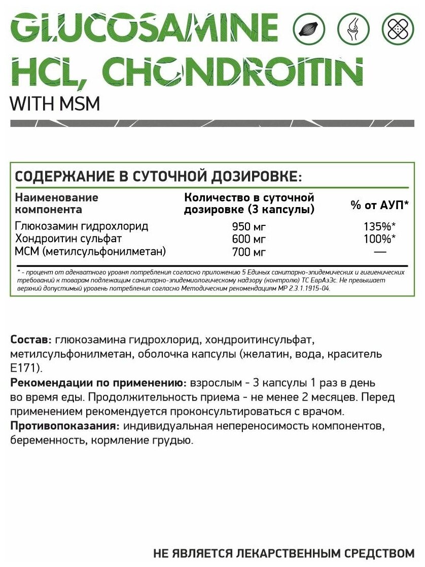| Дополнительная информация | рекомендации по применению: взрослым - 3 капсулы 1 раз в день во время еды; продолжительность приема - не менее 2 месяцев; состав: глюкозамина гидрохлорид, хондроитинсульфат, метилсульфонилметан, оболочка капсулы (желатин, вода, краситель е171) |