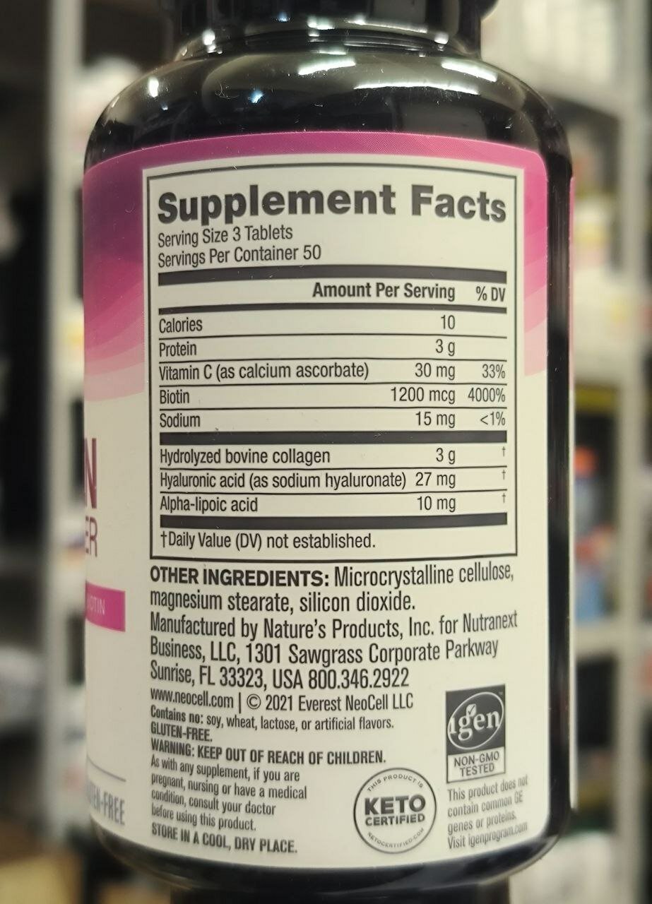 | Дополнительная информация | энергетическая ценность на 1 порцию (3 таблетки): калорийность - 1- ккал, белки - 3 г, витамин C (в виде аскорбата кальция) - 30 мг, биотин - 1200 мкг, гидролизованный бычий коллаген - 3 г, гиалуроновая кислота (в виде гиалуроната натрия) - 27 мг, альфа-липоевая кислота - 10 мг; рекомендации по применению: принимать по 3 таблетки в день, предпочтительнее в утреннее время, запивая стаканом воды; перед началом применения препарата во время беременности, кормления грудью или при наличии заболеваний следует проконсультироваться с врачом; состав: витамин C (в виде аскорбата кальция), биотин, гидролизованный бычий коллаген, гиалуроновая кислота (в виде гиалуроната натрия), альфа-липоевая кислота, микрокристаллическая целлюлоза, растительный стеарат магния, диоксид кремния |