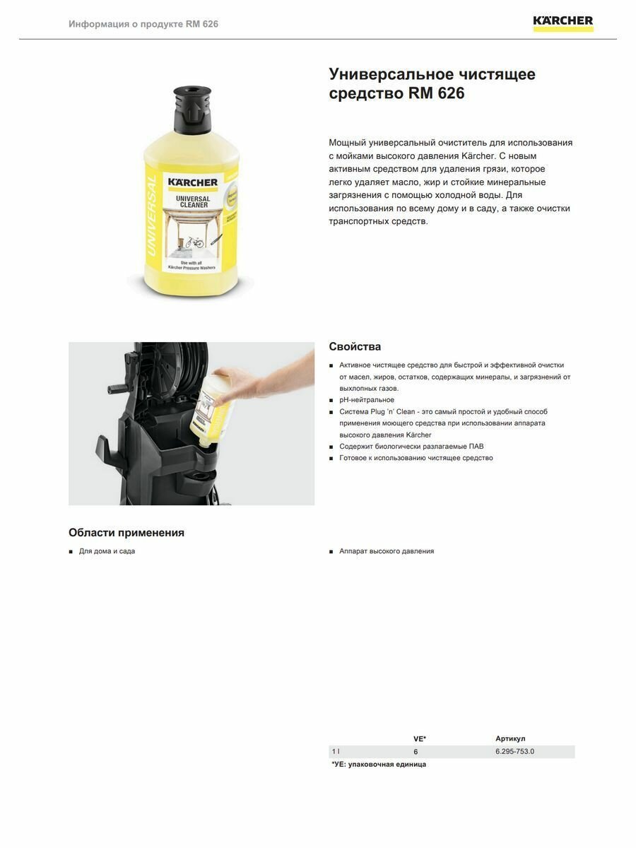 | Дополнительная информация | быстрое и эффективное удаление масляно-жировых, минеральных и атмосферных загрязнений; pH-нейтральное; готовое к применению чистящее средство |