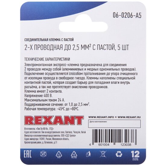 Клемма соединительная с пастой на 2 проводника (сечение 1-2.5 мм2), 5 шт. интересное: