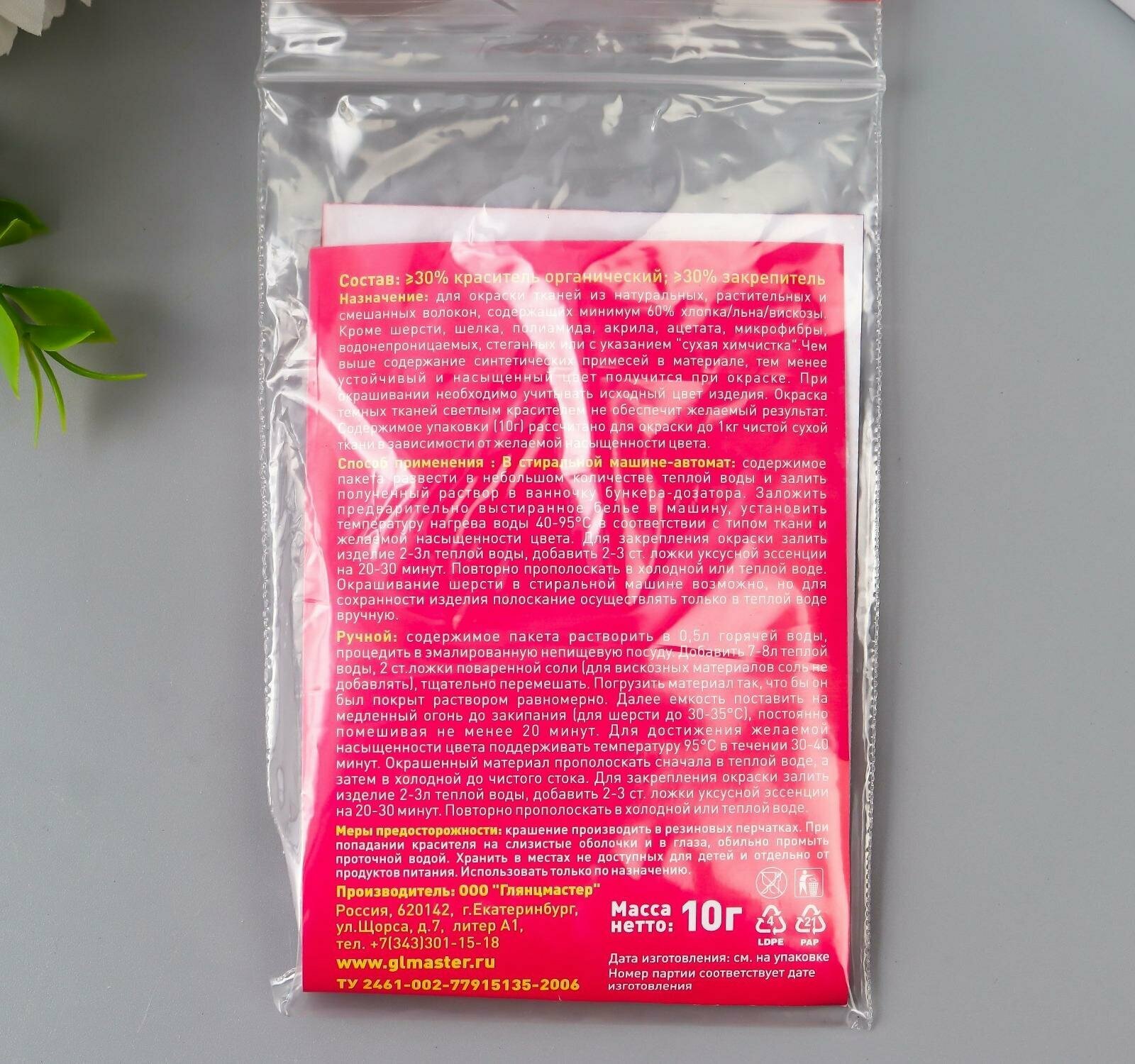 | Дополнительная информация | содержимое упаковки (10г) рассчитано для окраски до 1кг чистой сухой ткани в зависимости от желаемой насыщенности цвета |