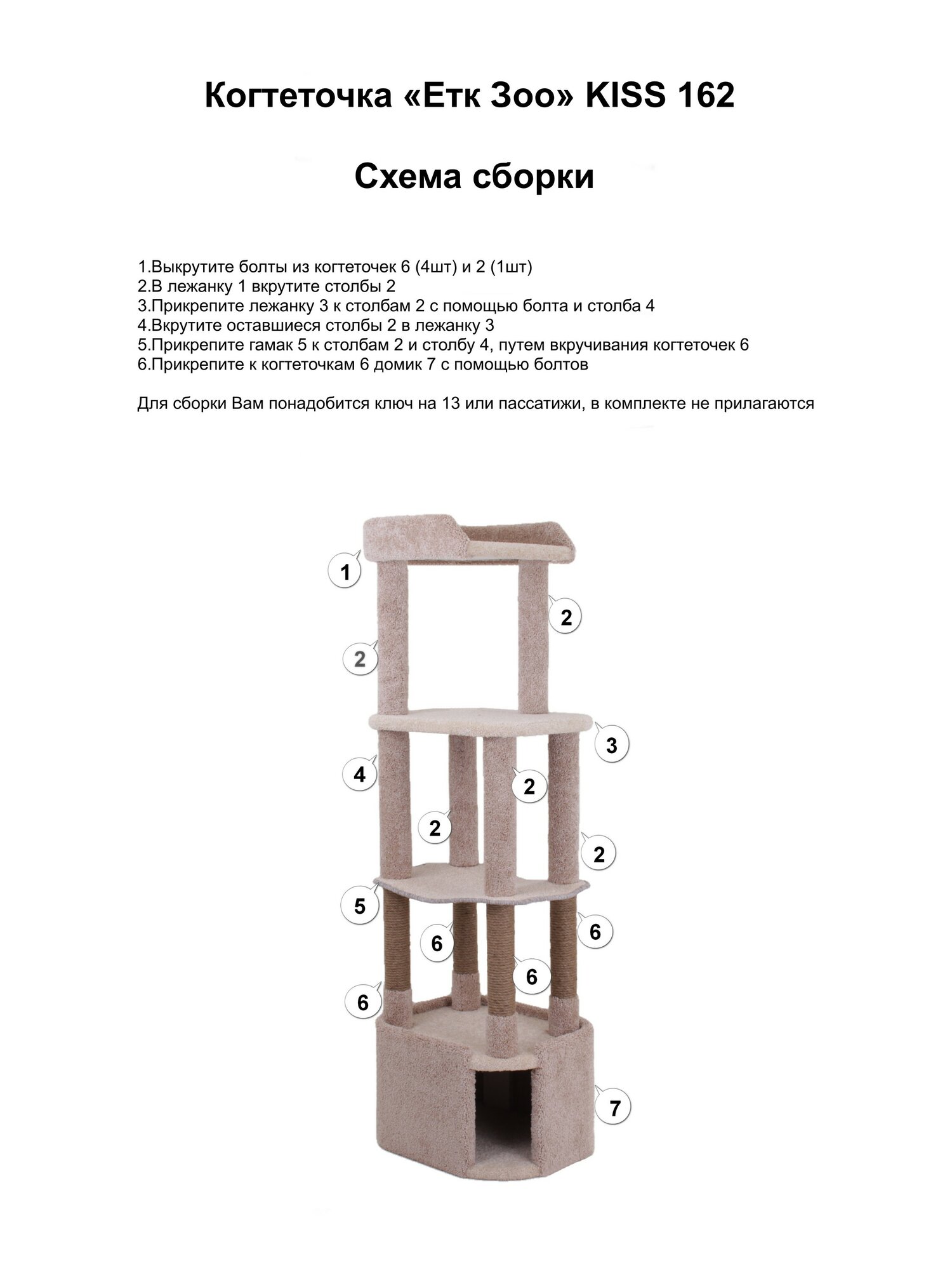 Когтеточка для кошек с домиком, гамаком и лежанками "Етк Зоо" Kiss 162, 40*52*162, бежевый ковролин, джут