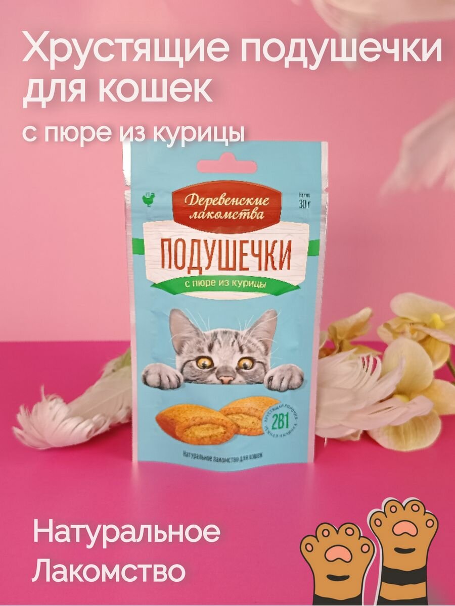 СохранитьДеревенские лакомства 5шт х 30г Подушечки с пюре из курицы, лакомства для кошек интересное: