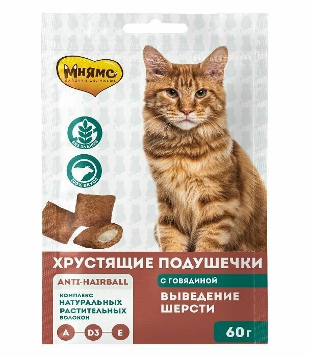 Лакомство хрустящие подушечки для кошек с говядиной Мнямс 60г*5шт Выведение шерсти интересное: