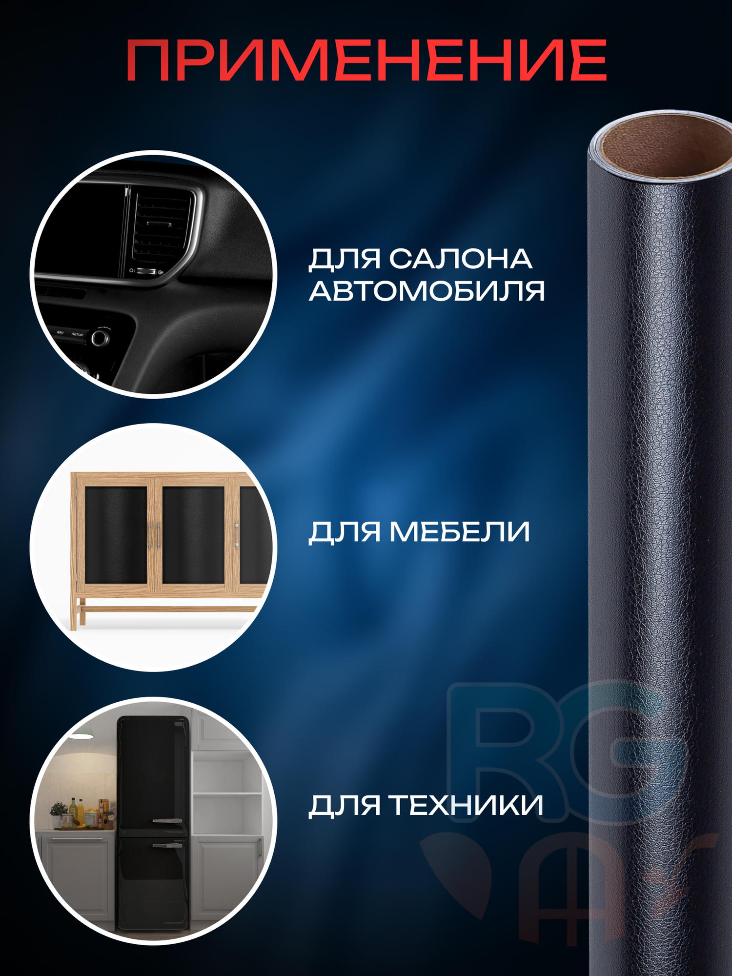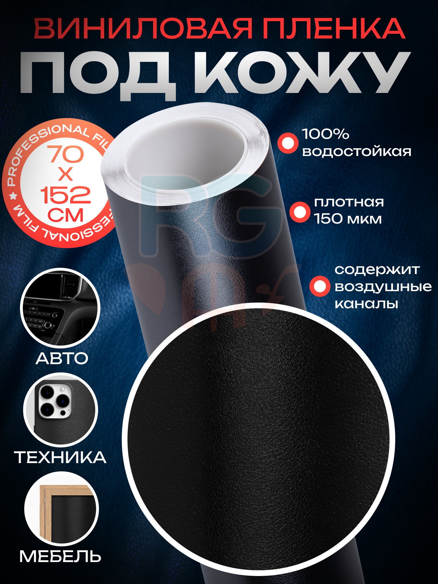 Виниловая пленка под кожу самоклеящаяся для автомобиля и декорирования интерьера: 152х100 см, цвет: черный