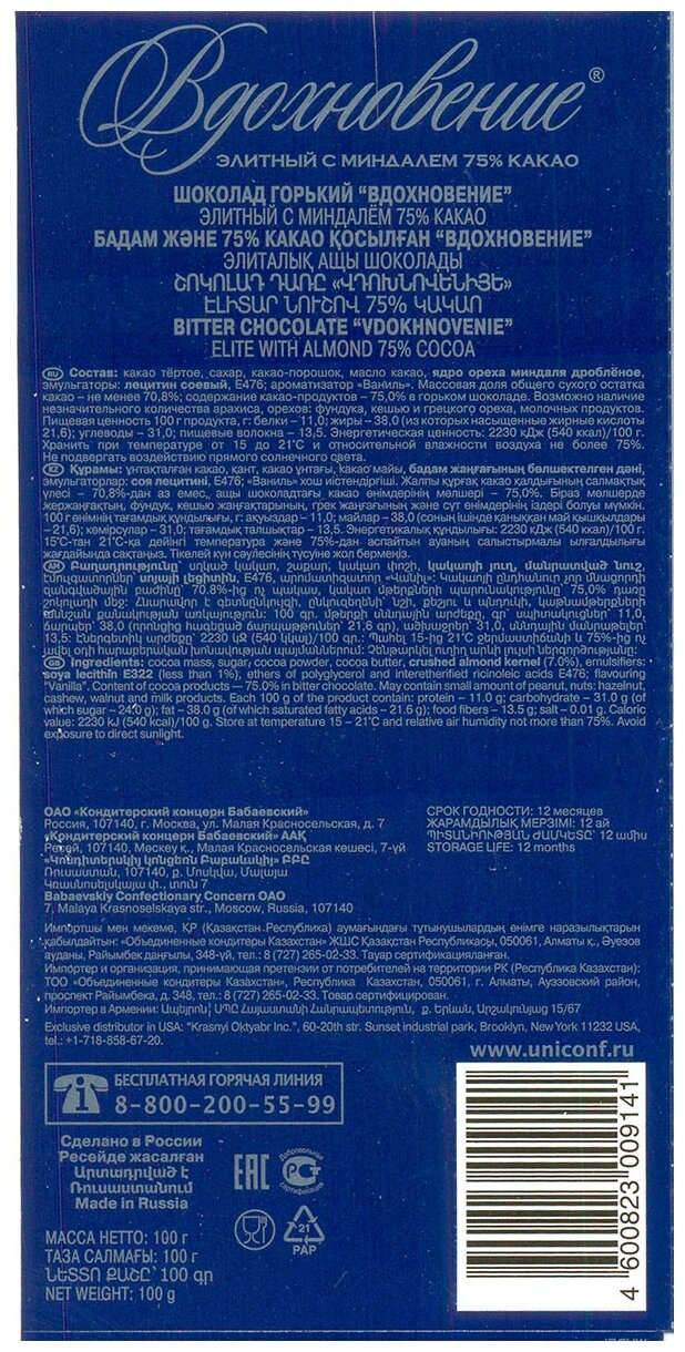 Ниже Вы можете прочитать отзывы на Шоколад Вдохновение с миндалем 75% какао, 100 гр., ознакомится с подробными характеристиками, посмотреть интересные обзоры и фотографии на Шоколад Вдохновение с миндалем 75% какао, 100 гр..