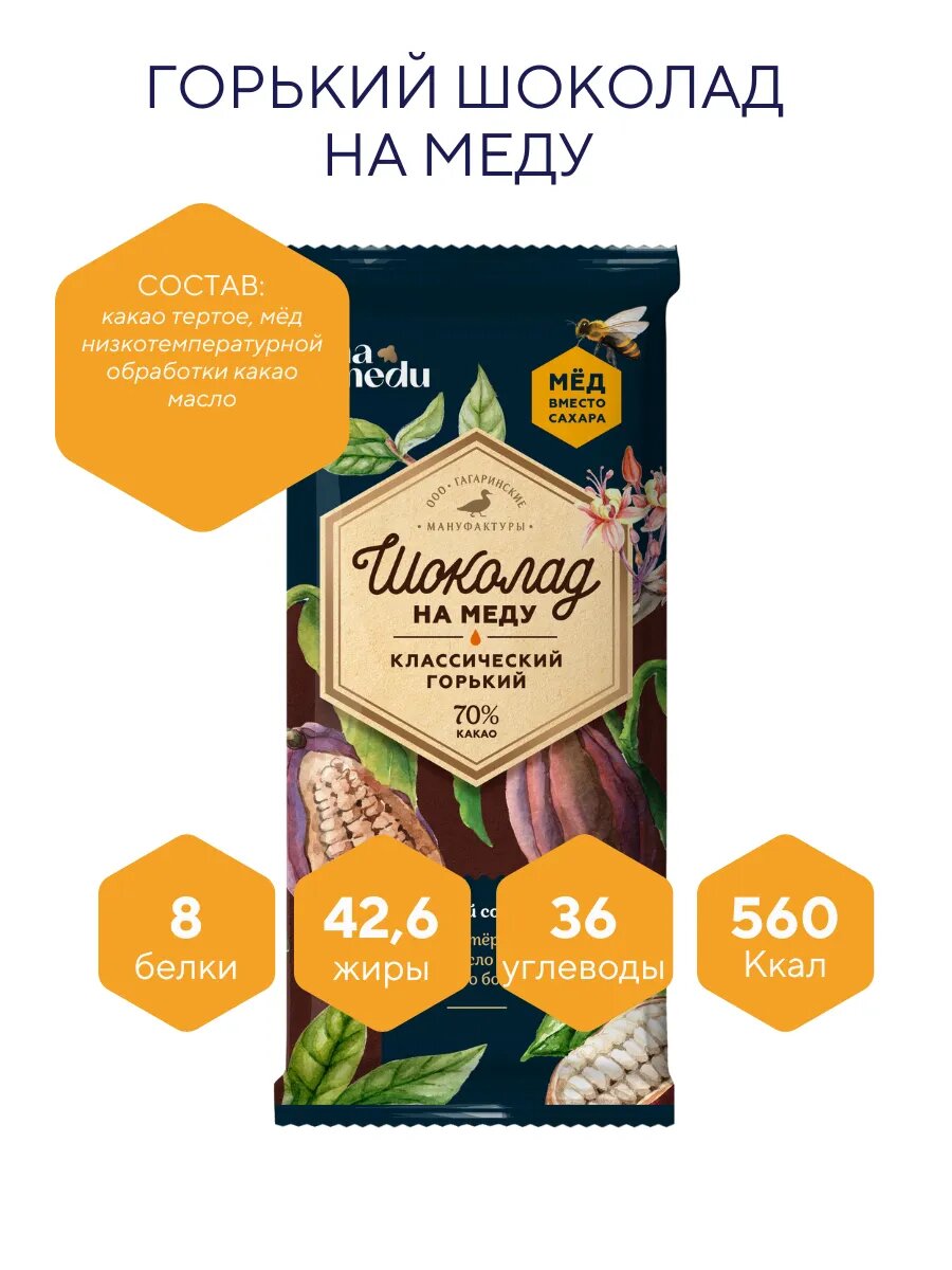 Шоколад горький Без сахара на меду 70% - 10 шт