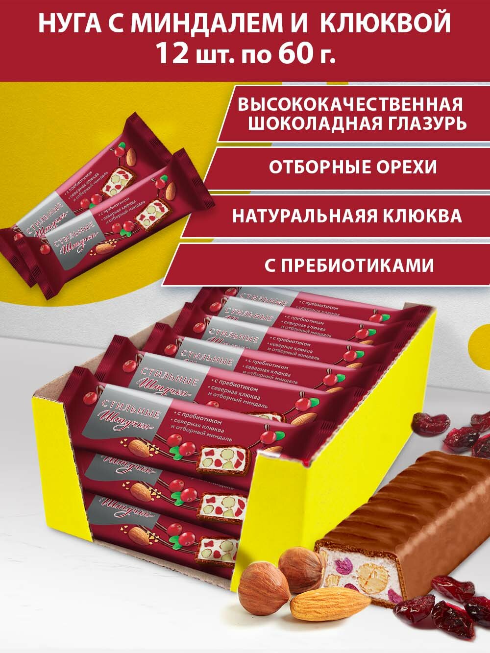 Батончик/конфеты "Стильные штучки" Нуга с миндалем и клюквой в шоколадной глазури, нуга с шоколадом, конфеты в шоколаде 60 г, 12 шт в шоу-боксе интересное: