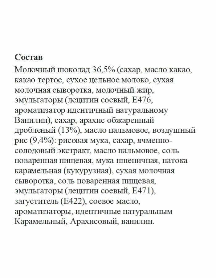 | Начинка | арахис / воздушный рис / изюм / карамель |