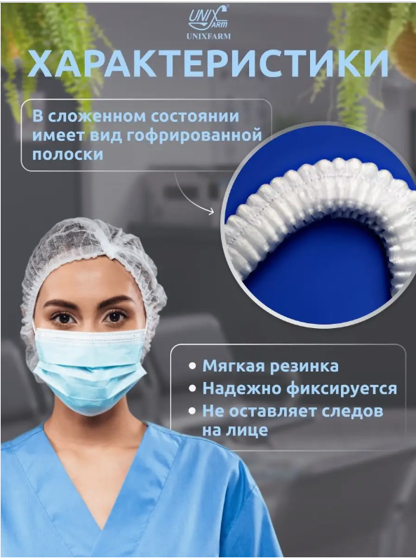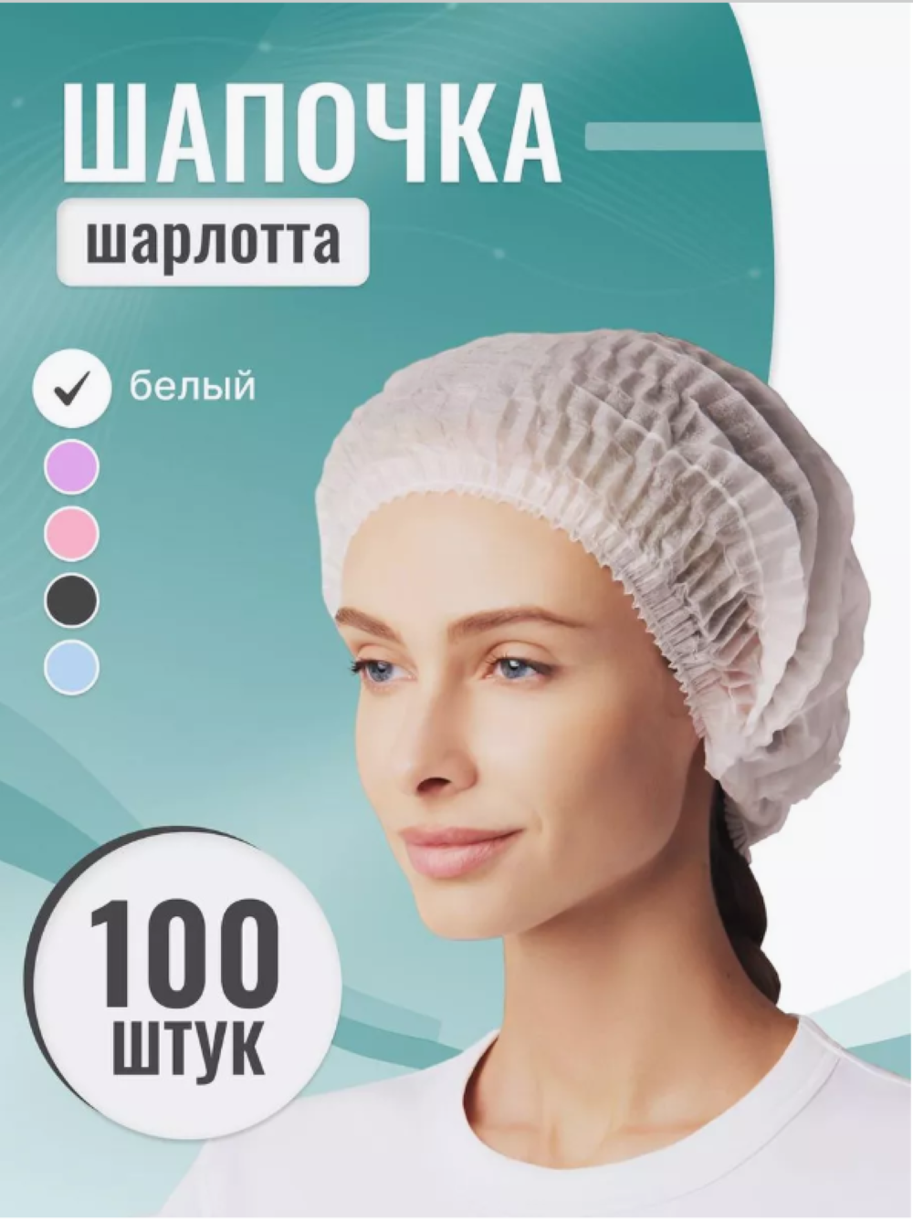 | Дополнительная информация | Разовые изделия , их форма по типу «Шарлотта» позволяет сдержать волосы различной длины, даже с объёмными прическами. Воздухопроницаемый материал и гипоаллергенность обеспечивают комфорт и безопасность при использовании медицинских аксессуаров . |