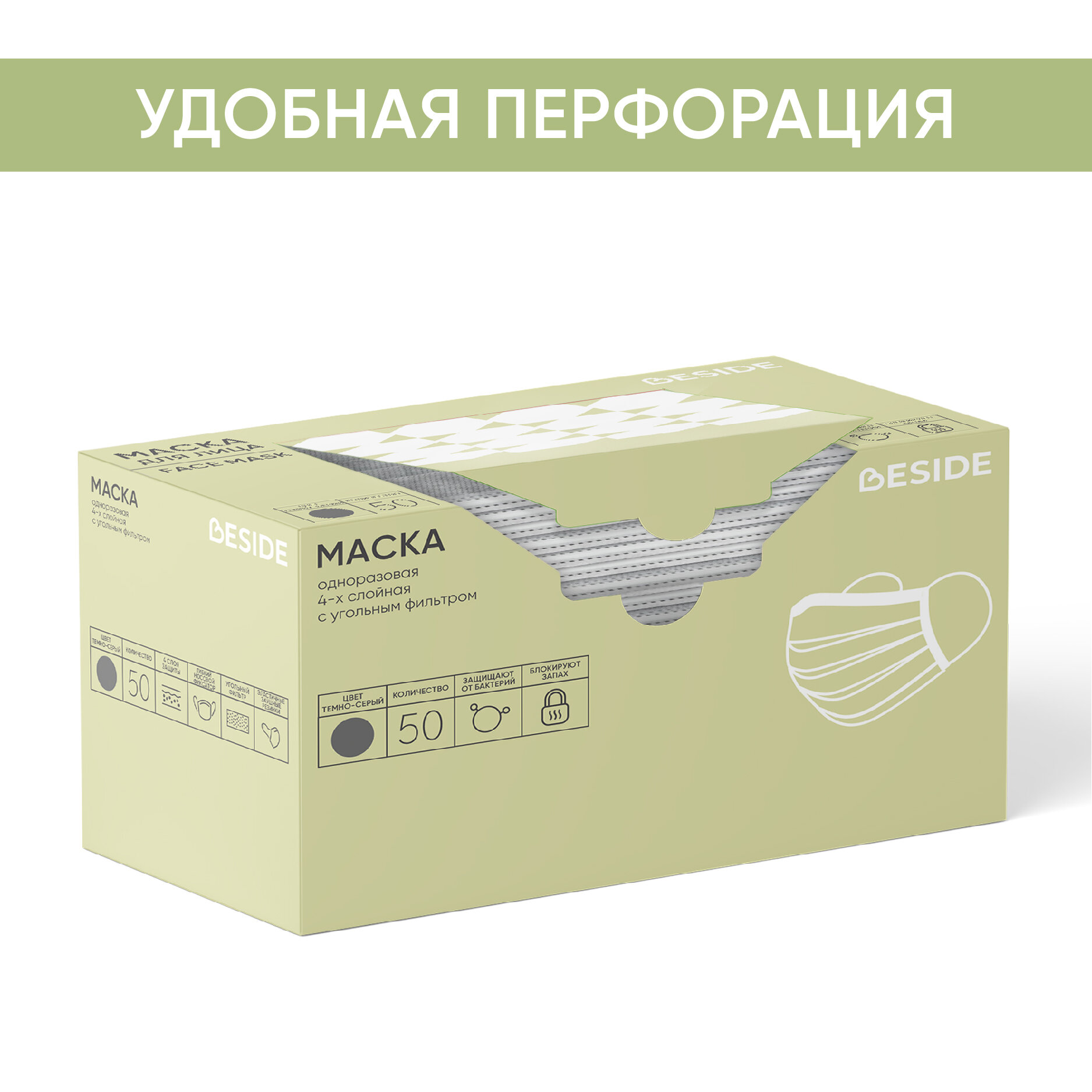 Купить Маски медицинские одноразовые для лица BESIDE, серые, 50 шт с угольным фильтром четырехслойные, мелтблаун, набор гигиенических защитных масок