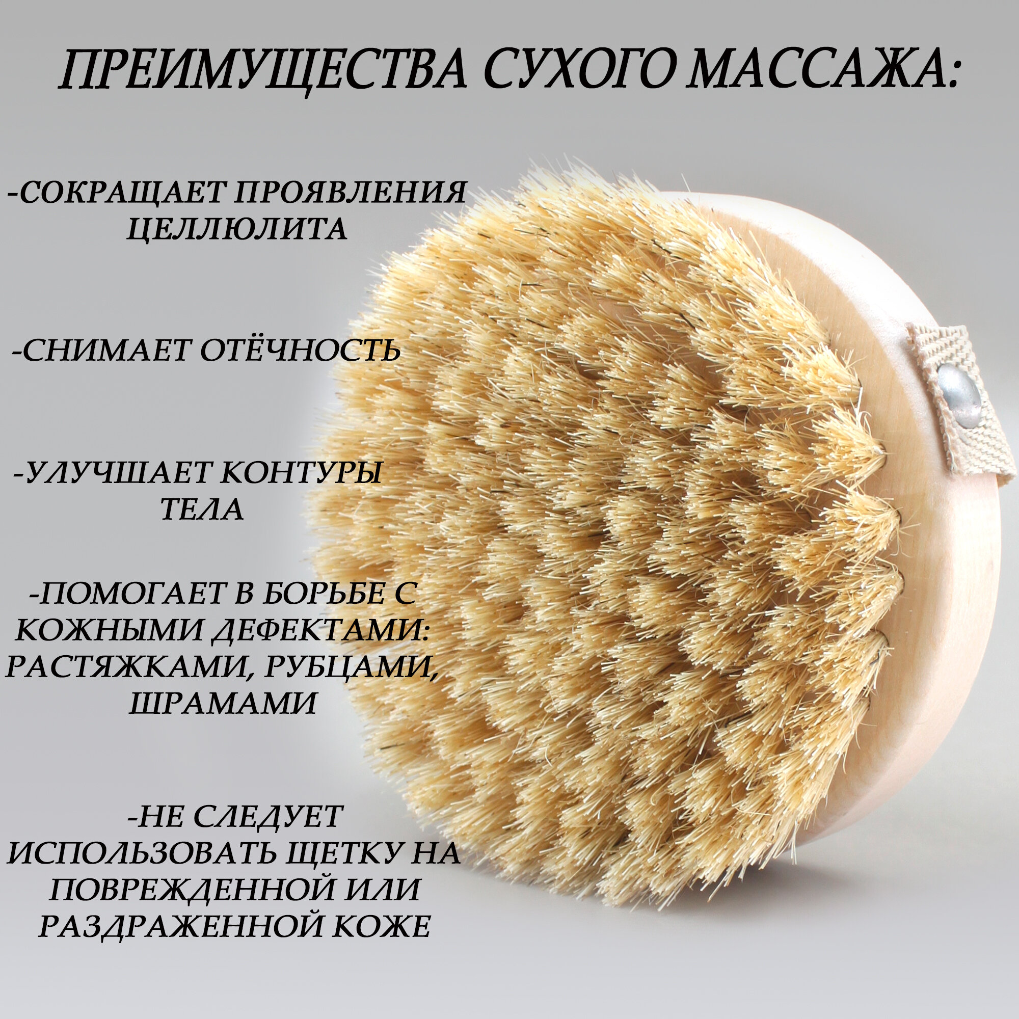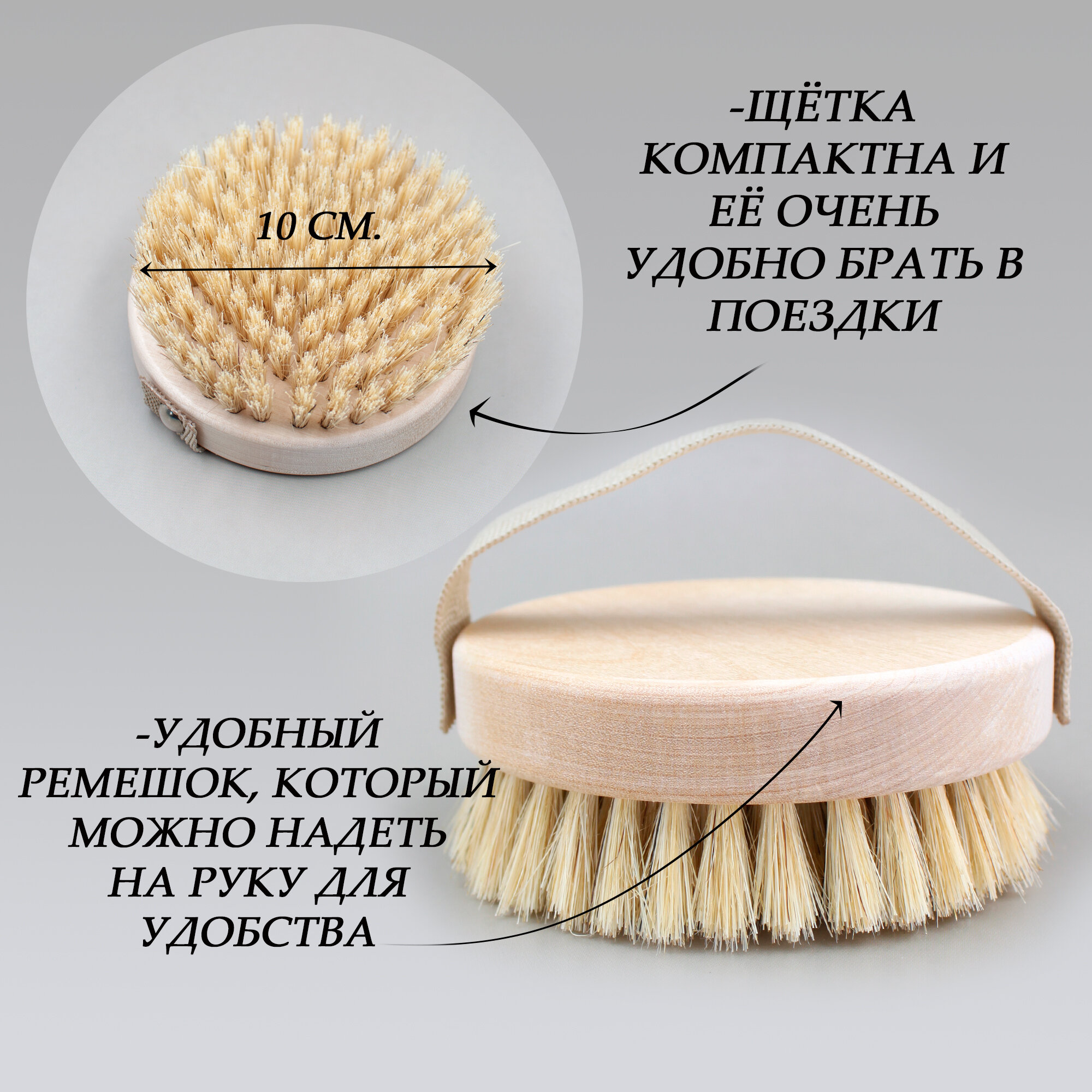 Щетка для сухого массажа тела, круглая, с ремешком, щетина кабана, средней жесткости интересное:
