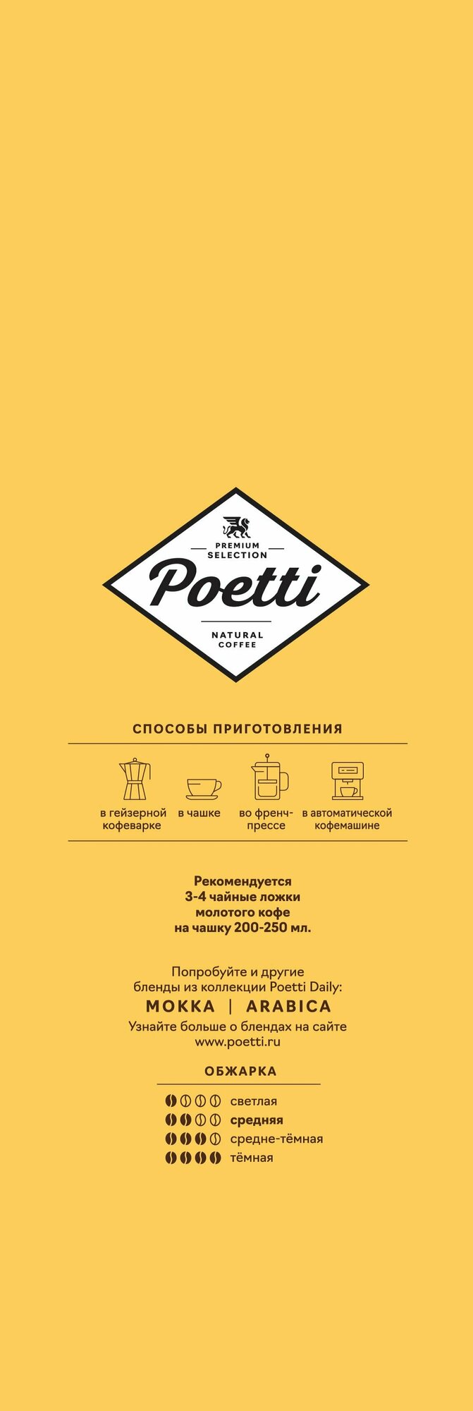 | Дополнительная информация | Способы приготовления: в гейзерной кофеварки, в фильтр-кофеварки, во френч-прессе, в автоматической кофемашине. |
