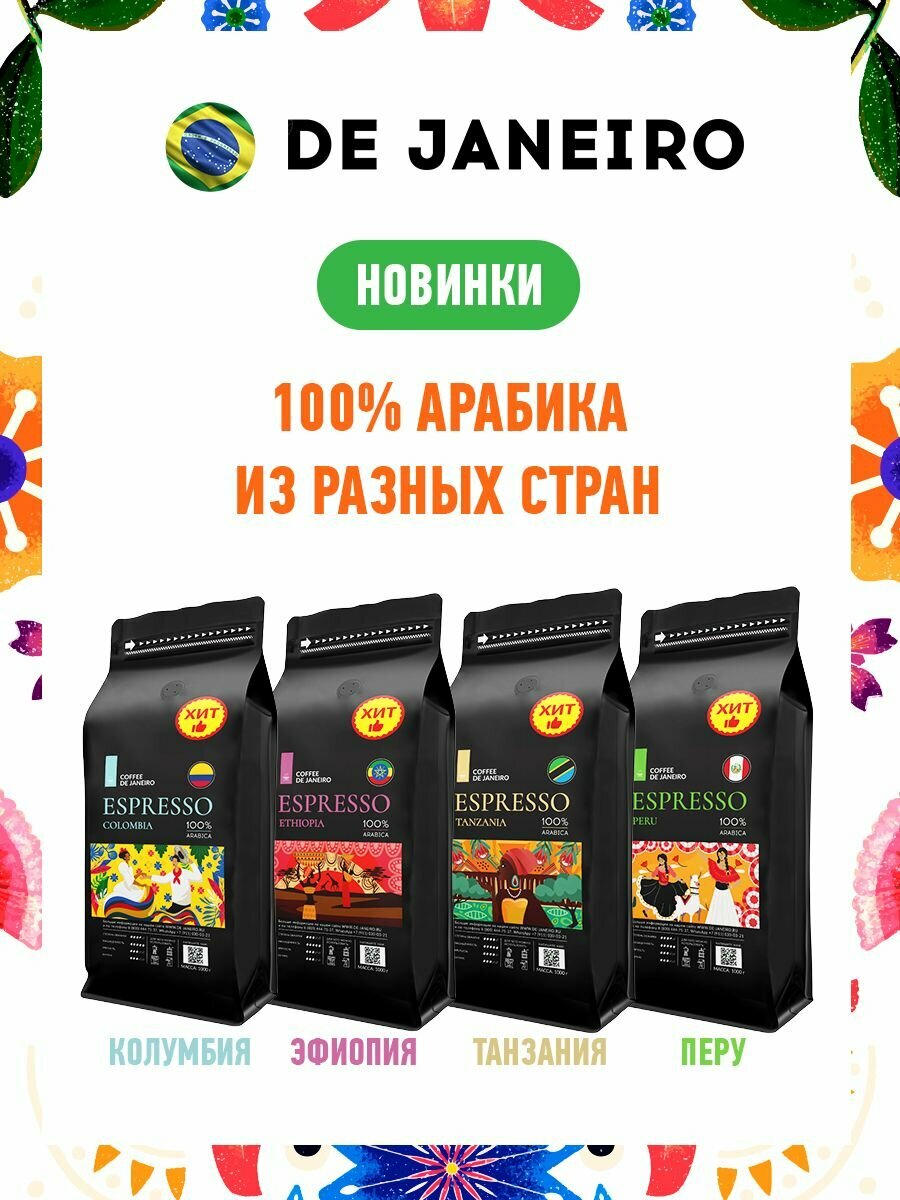 Бразильский кофе в зёрнах 1кг DE JANEIRO (ДЕ жанейро) Кофе в зёрнах 1 кг ESPRESSO ETHIOPIA 100% Арабика, в упаковке Zip-Lock / Зерновой кофе 1 кг