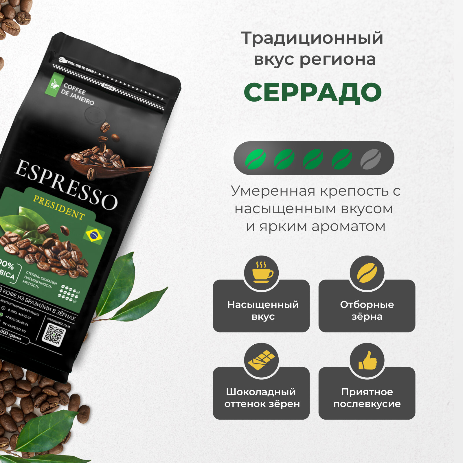 Кофе в зернах 1 кг DE JANEIRO (Де Жанейро) ESPRESSO PRESIDENT 100% Арабика, Zip-Lock, кофе зерновой, Бразилия интересное: