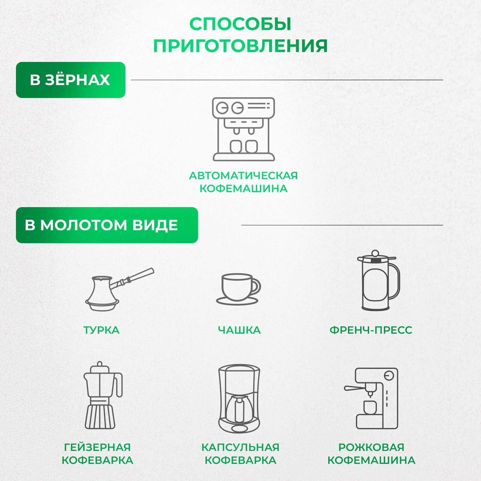 | Вид напитка | американо, гляссе, капучино, кортадо, кофе по-турецки, кофе с молоком, крема, латте, латте макиато, макиато, моккачино, ристретто, фильтр-кофе, черный кофе, чокочино, эспрессо, эспрессо-лунго |