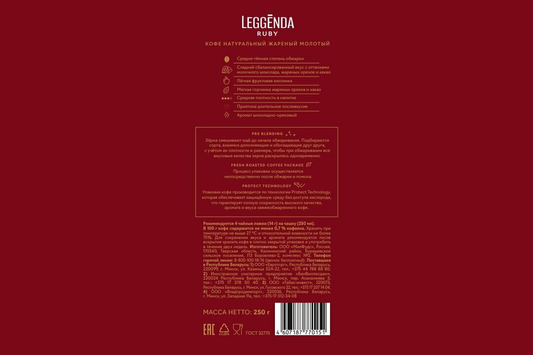 Кофе молотый Poetti Leggenda Ruby 250 г, набор из 2 шт