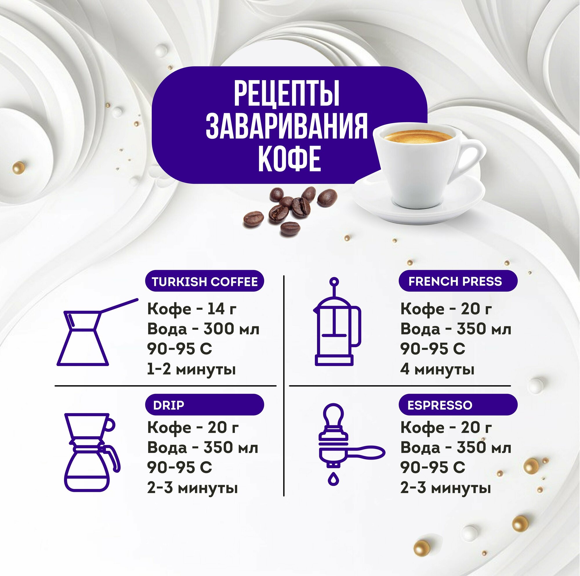 | Способ заваривания | аэропресс, гейзерная кофеварка (мока), джезва, кемекс, пуровер, сифон, френч-пресс, чашка, эспрессо |