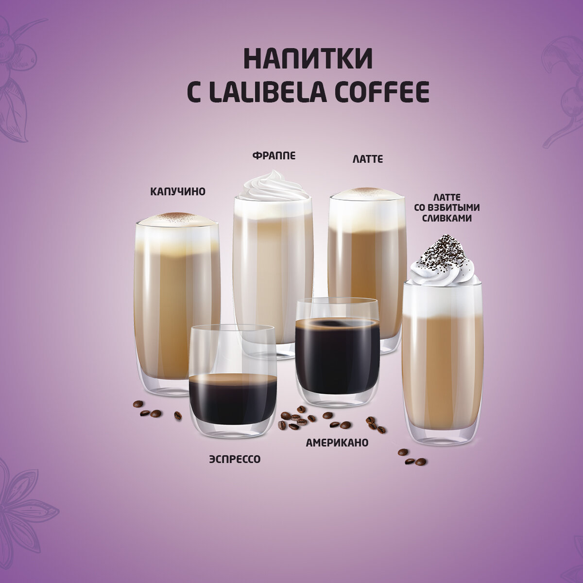 | Вид напитка | американо / гляссе / капучино / кортадо / кофе по-турецки / кофе с молоком / крема / латте / латте макиато / макиато / моккачино / ристретто / фильтр-кофе / черный кофе / чокочино / эспрессо / эспрессо-лунго |