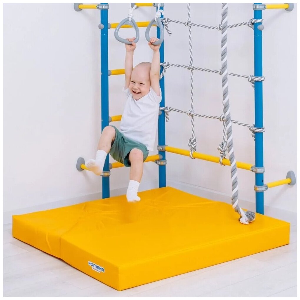 Мат гимнастический складной спортивный для шведской стенки мягкий детский 4 секции 100х200х10 см, толщина 10см. Цвет синий/желтый
